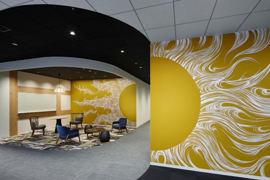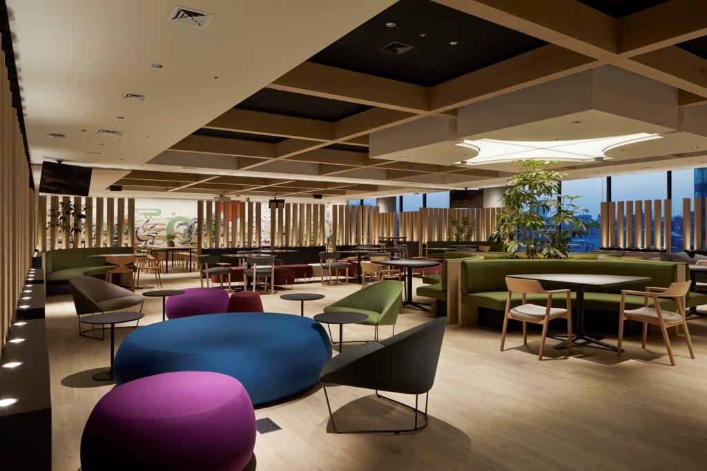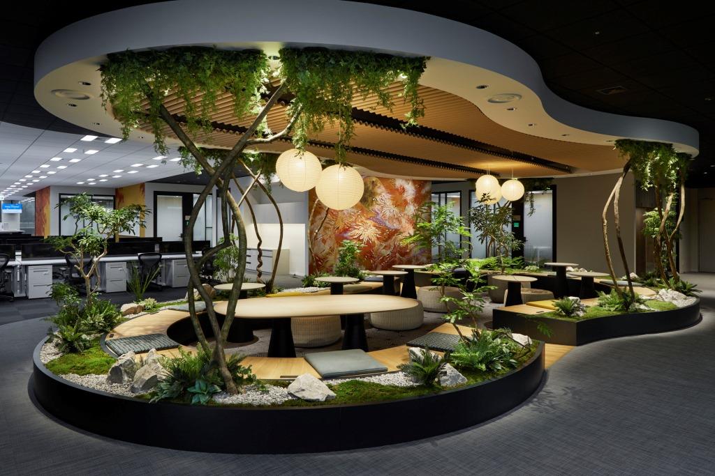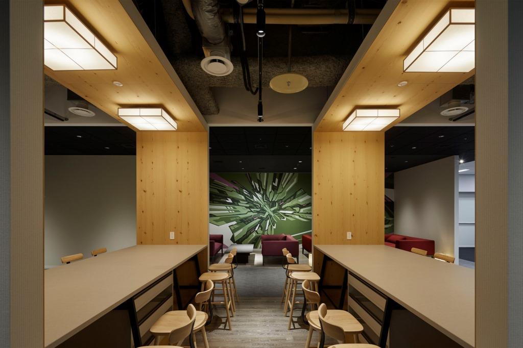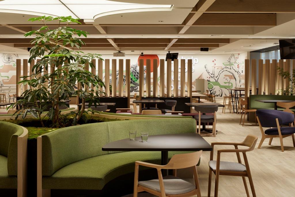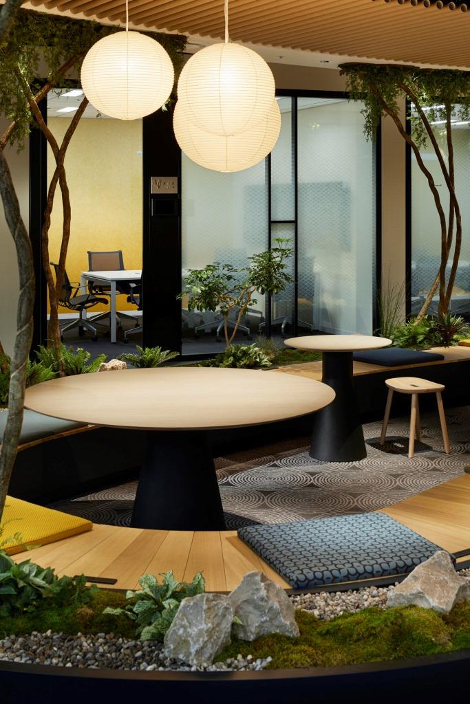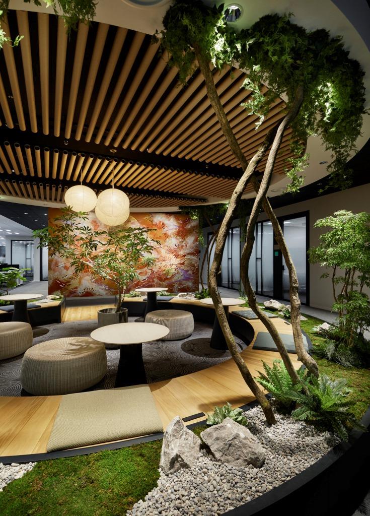 Gli spazi di lavoro, luminosi e ampi, sono infatti punteggiati da una serie di piccole oasi, quasi giardini zen in miniatura, cui il verde, i colori delicati e un’illuminazione soffusa conferiscono un mood intimo e rilassante, mentre alle pareti murales dalle tinte vivaci riproducono gli stilemi e i segni grafici dell’arte tradizionale giapponese.
