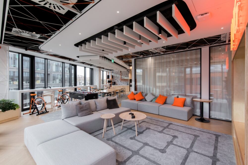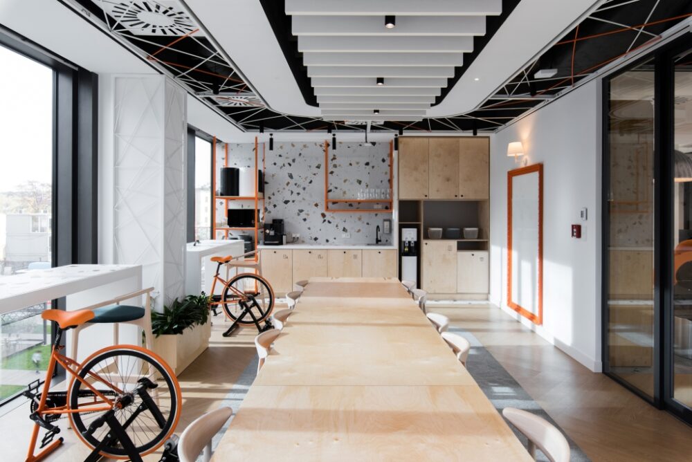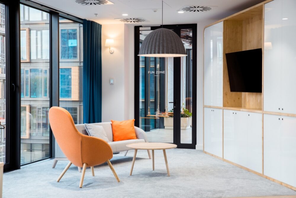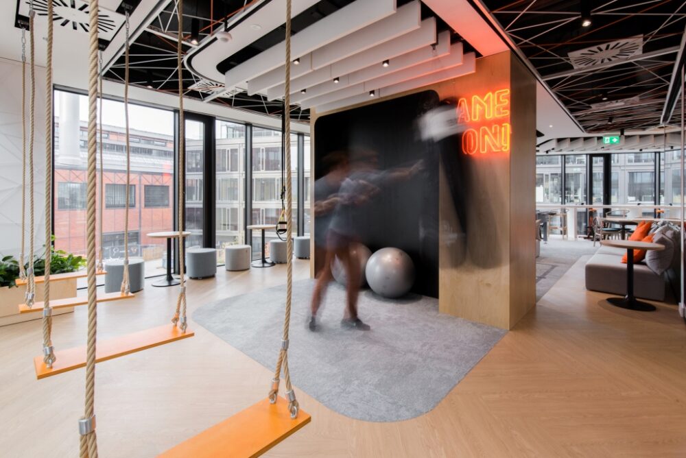 In particolare, la Fun-Zone è un luogo di svago dove ritrovare energia e concentrazione senza dover necessariamente uscire dall’ufficio. Oltre alla cucina e alle postazioni per ricaricare il telefono si trovano le cyclette con vista sulla città, un tavolo da ping-pong, la tv con annessa playstation, un sacco da box e alcune gym balls.