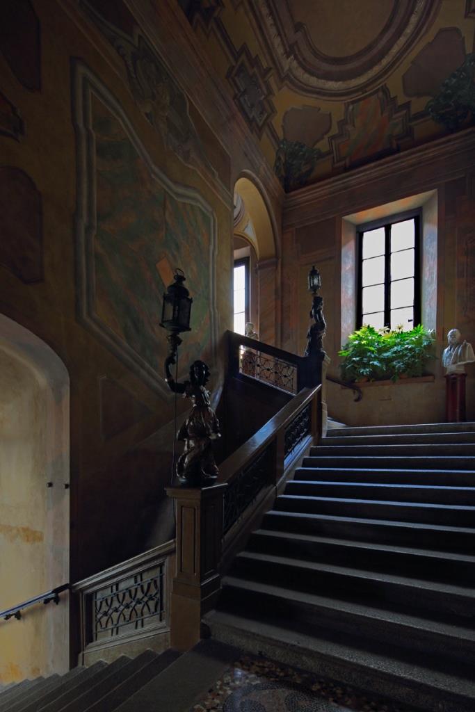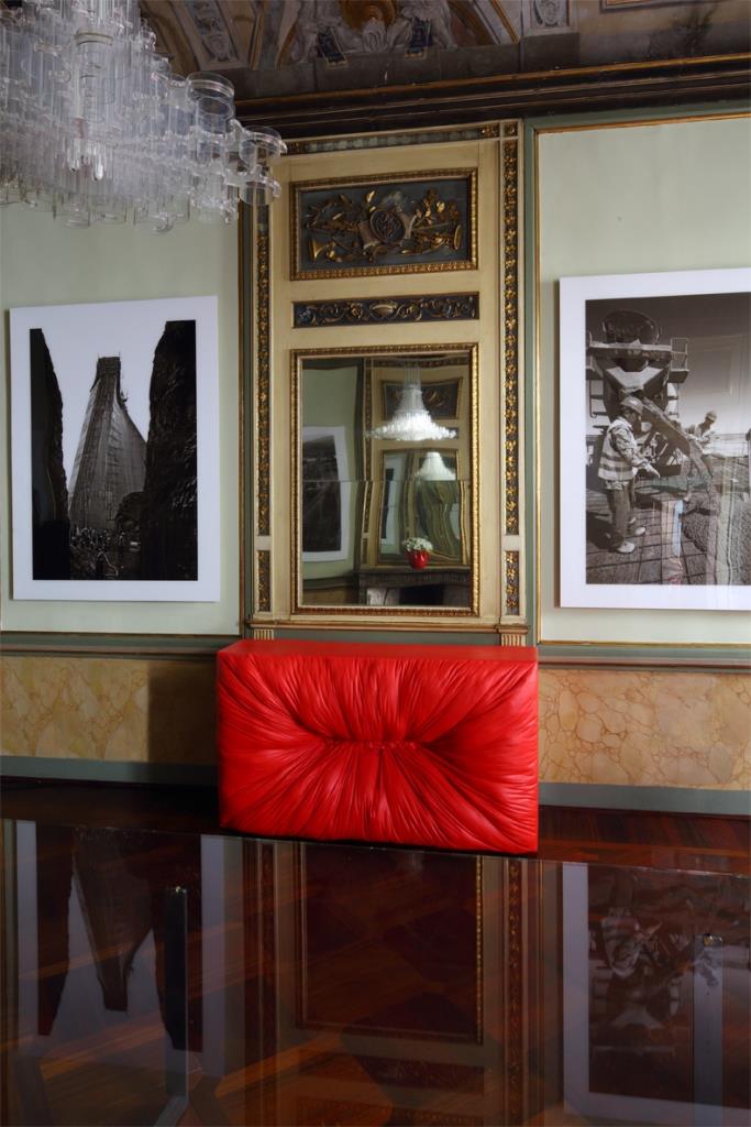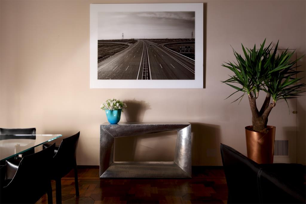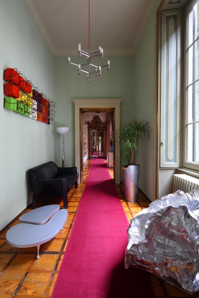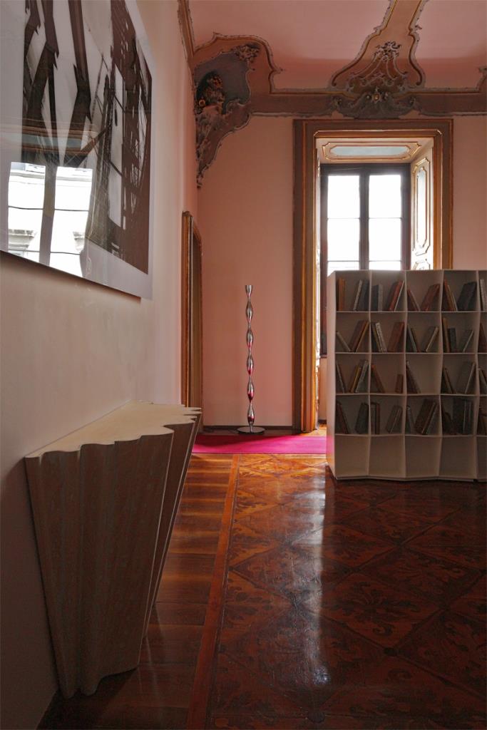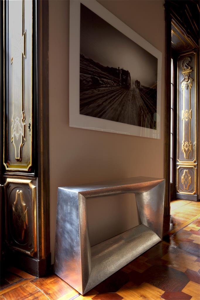 Originale anche la coppia di consolle gemelle Alluminio, sempre opera di Tacchinardi, collocate specularmente sui due lati di una stanza una di fronte all’altra, dove la linea che le collega, perpendicolare al corridoio, segna il percorso e divide i due spazi funzionali differenti interni alla stanza ufficio: tavolo riunioni operativo e salotto con camino.