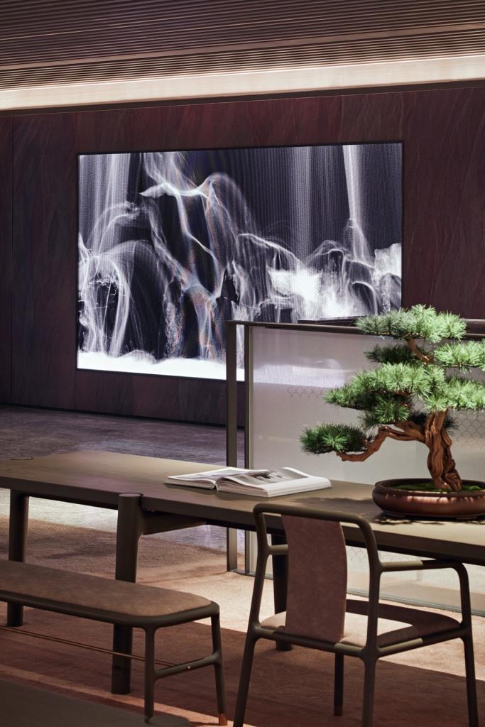 L’atmosfera è quasi sospesa, gli ambienti ampi, arredati con pochi oggetti e complementi, sono luoghi dove lo sguardo può respirare e la mente lasciarsi alle spalle rumore e frenesia. A trainarla, anche la forza immaginifica dell’arte multimediale “woyou” (letteralmente, “vagare sdraiati”) di Cui Kaimin, arte che pare evocare storie di libertà, e dipinti ispirati alla tradizione.