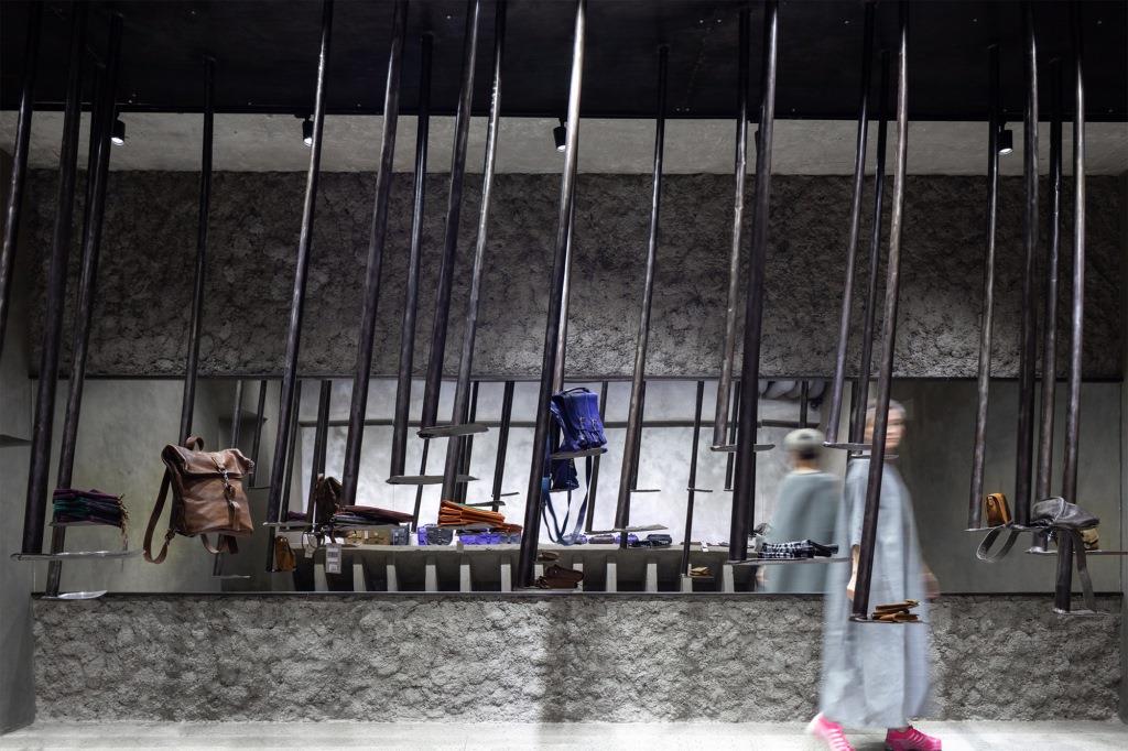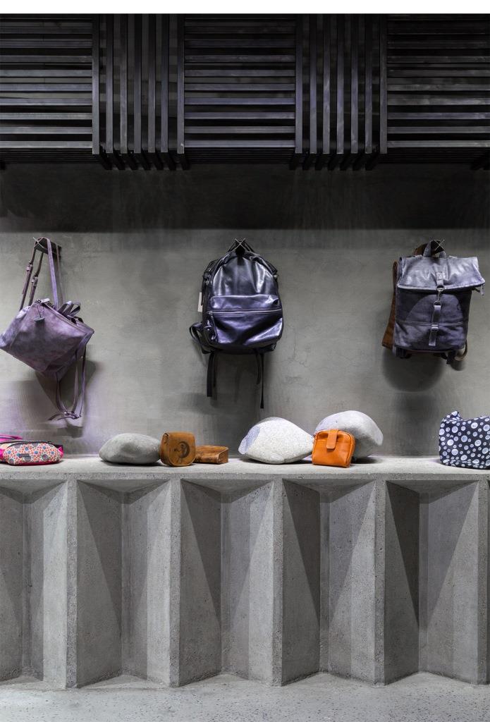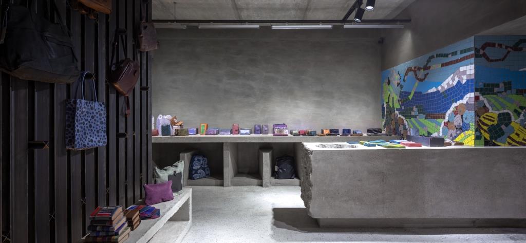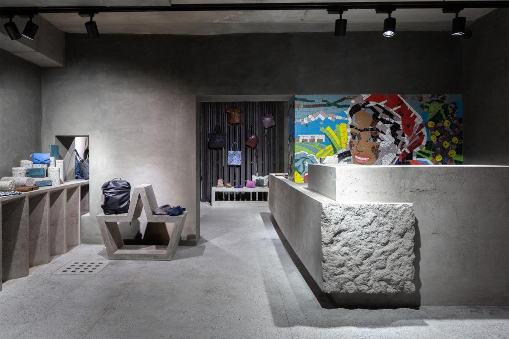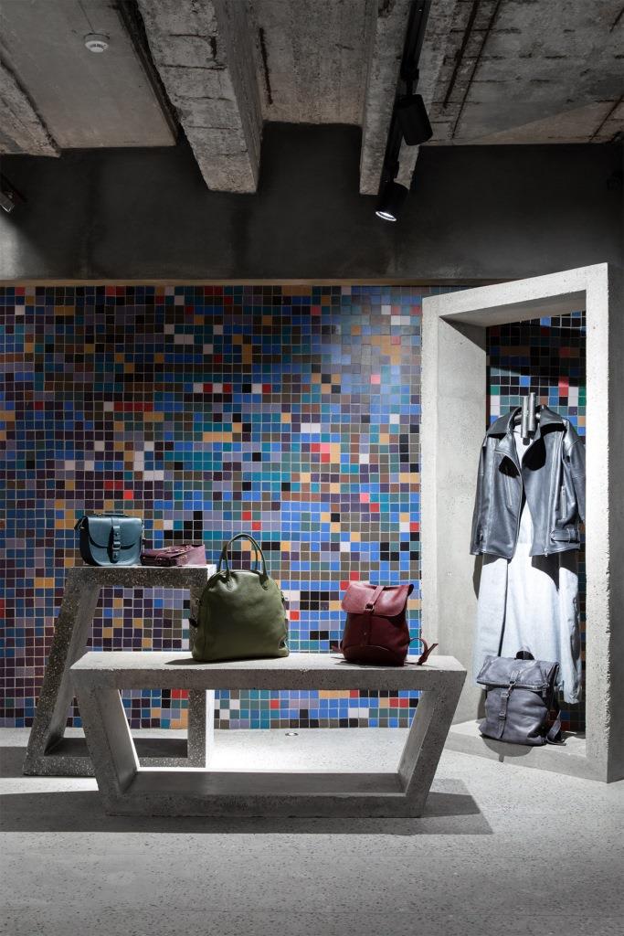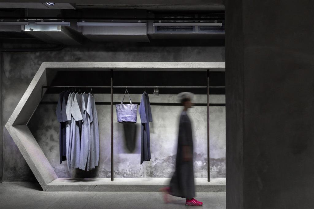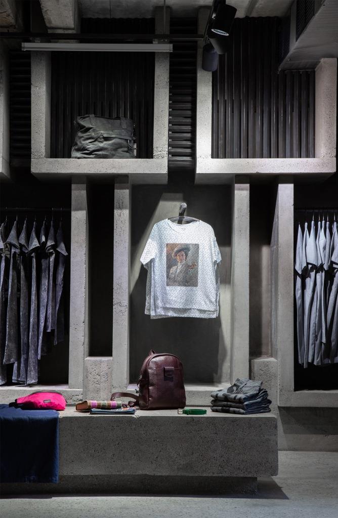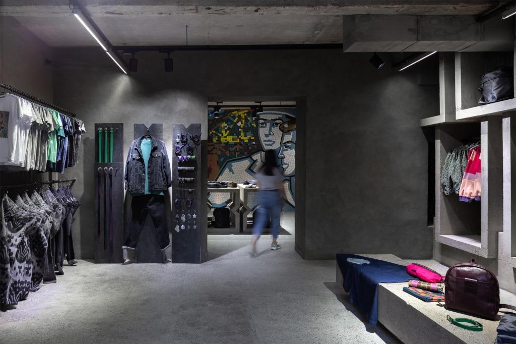 Fra questi, un grande modulo trapezoidale e ampi banconi che riprendono la geometria delle travi scatolari prefabbricate e offrono con il loro colore grigio uno sfondo su cui spiccano colori e forme delle creazioni di moda esposte nello store, mentre altri elementi si ispirano alle forme dei brise soleil in facciata.