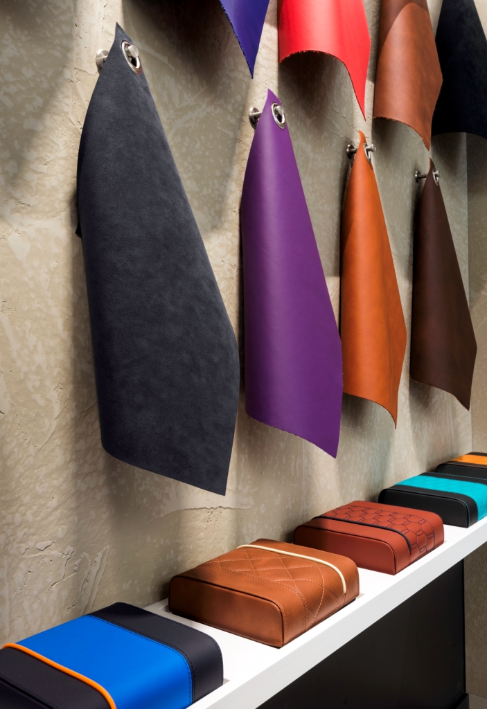 Sono qui presentati gli allestimenti delle automobili, che comprendono pellami pregiati agganciati alle pareti – quasi a farne un tema decorativo -, modelli di rivestimento dei sedili arricchiti dalle impunture e bordature disponibili e volanti e cerchi in lega trattati come veri e propri elementi scultorei