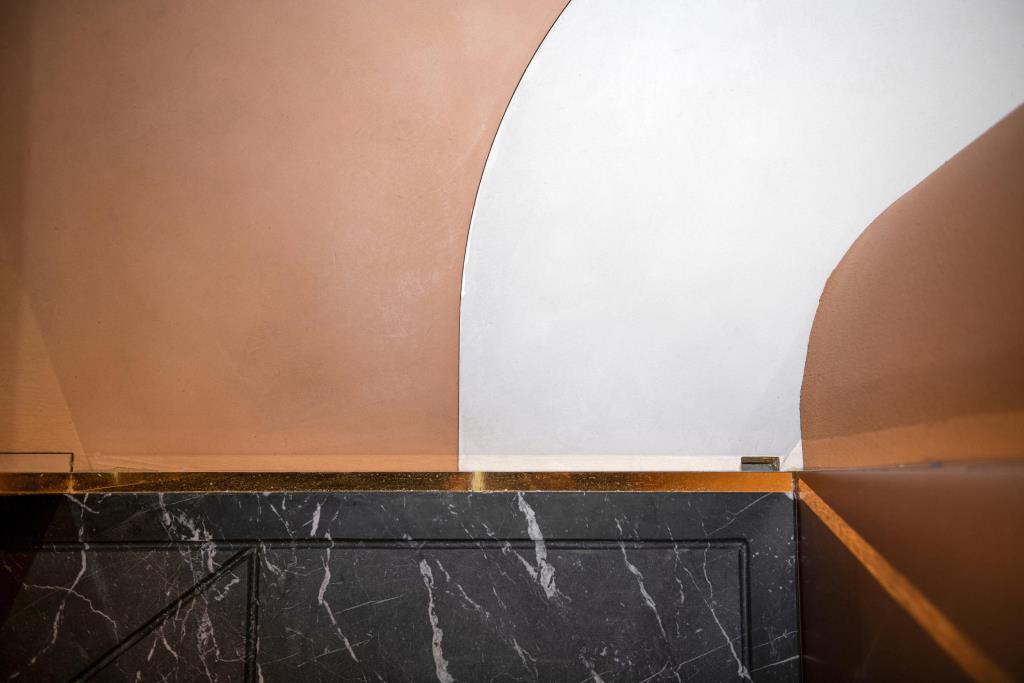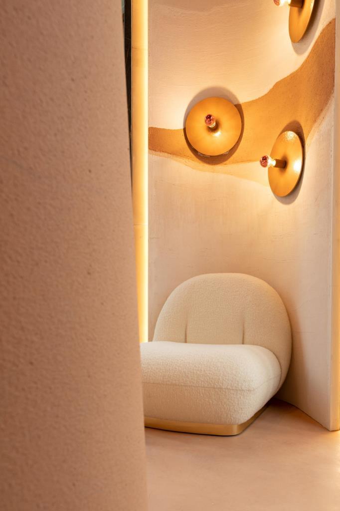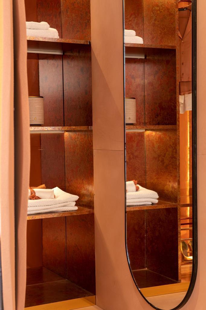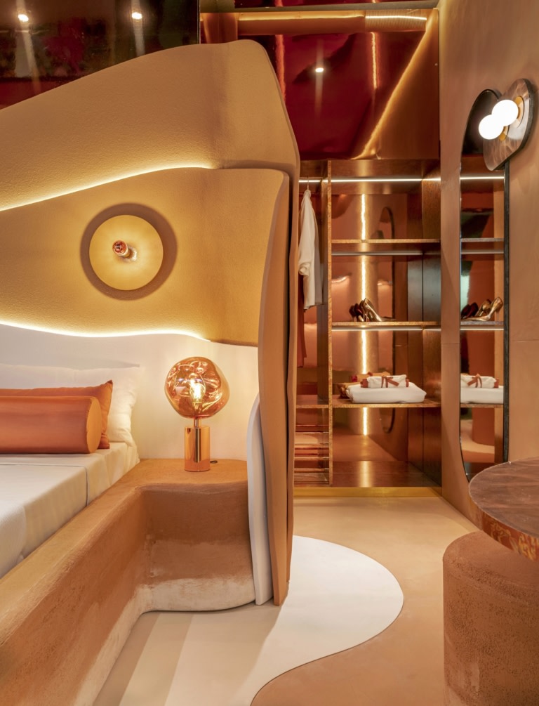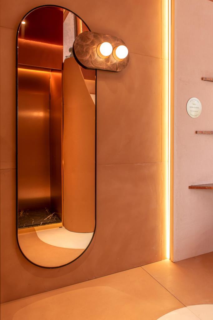 In uno spazio di 20 metri quadrati il vibrante soffitto in pannelli a specchio si contrappone al pavimento in eco-cemento bianco e color terracotta. Nuance, questa, che dona calore all’ambiente evocando le sfumature della sabbia e del deserto, il sapore di certi paesaggi africani.
