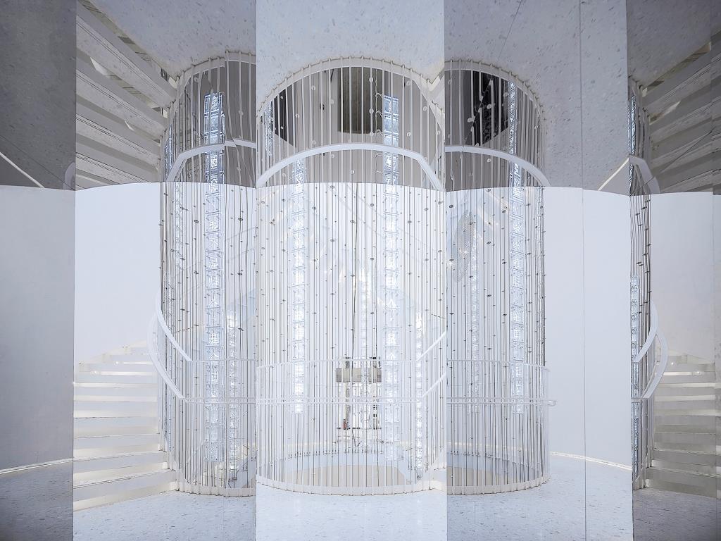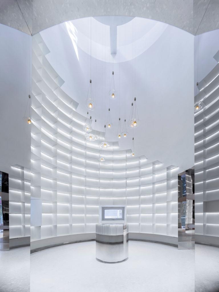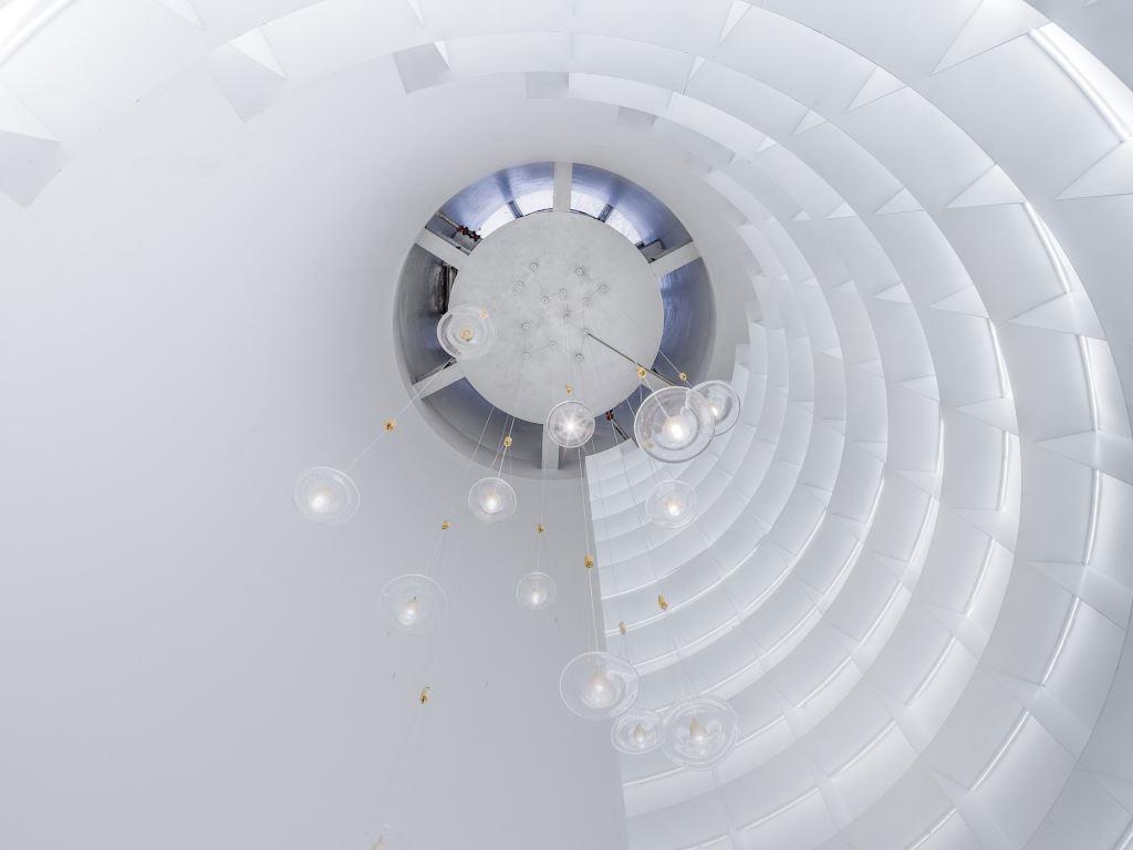 L’andamento spiraliforme delle strutture è accentuato dagli scaffali espositivi realizzati in sottili lastre di acciaio verniciato, anch’essi esplicito richiamo alle pagine di un libro, che con i loro pieni e vuoti esaltano la percezione dimensionale dello spazio. Un’illuminazione d’accento è fornita da discrete sospensioni le cui forme quasi si dissolvono nel candore delle pareti, mentre in prossimità della sommità una sottile trama di cavi in acciaio richiama visivamente l’immagine di un portale di accesso verso una nuova dimensione dello spirito.