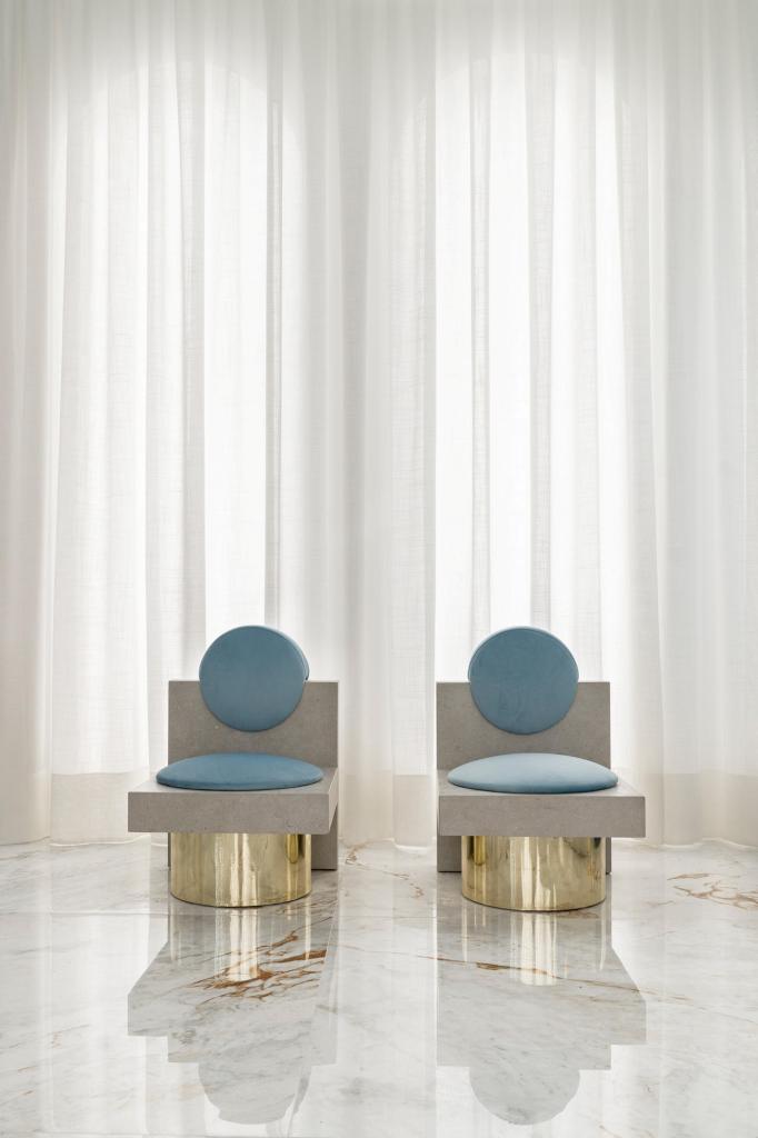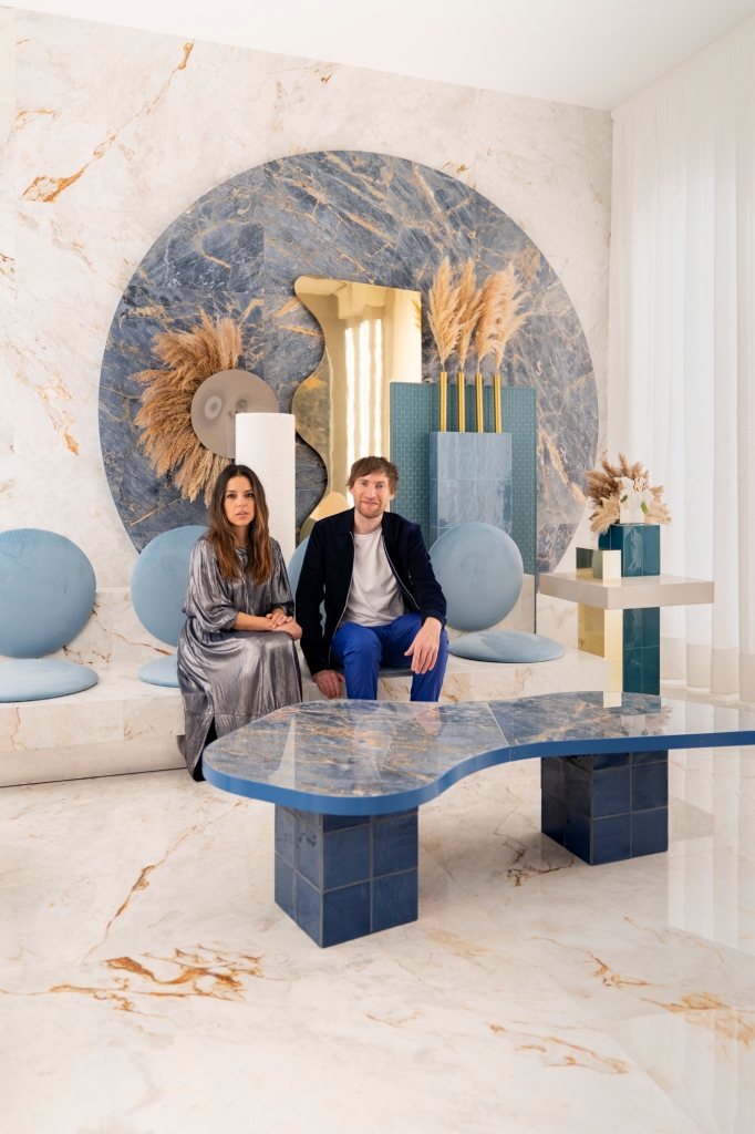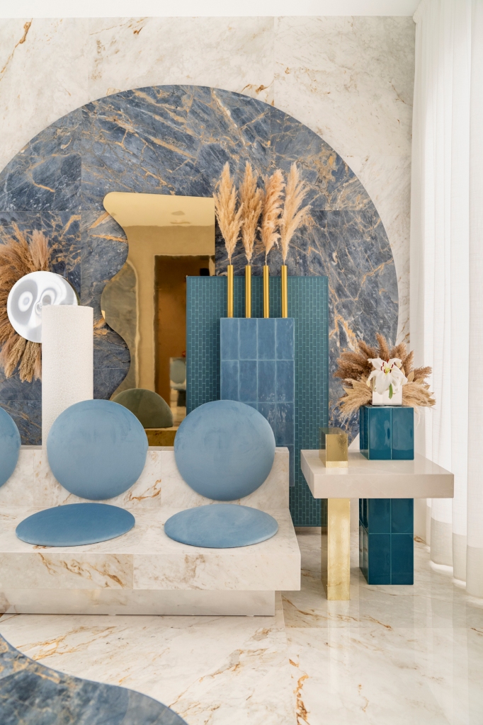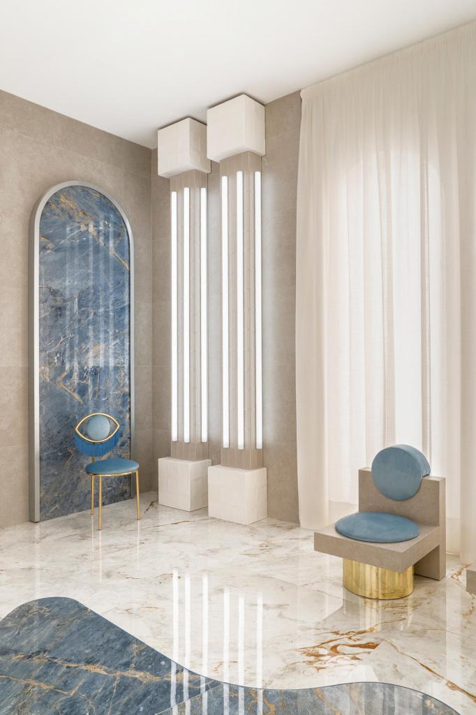 Luce che emerge dai riflessi del marmo lucido e che si espande in gamme di colore più ampie rispetto a quelle della pietra naturale, includendo finiture luminose come l’indaco e il cobalto del marmo Nouveau e il bianco con striature ocra incrociate di marmo Parana.