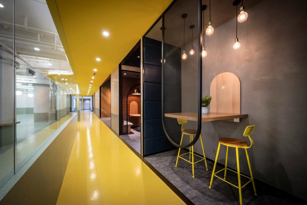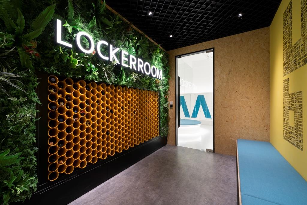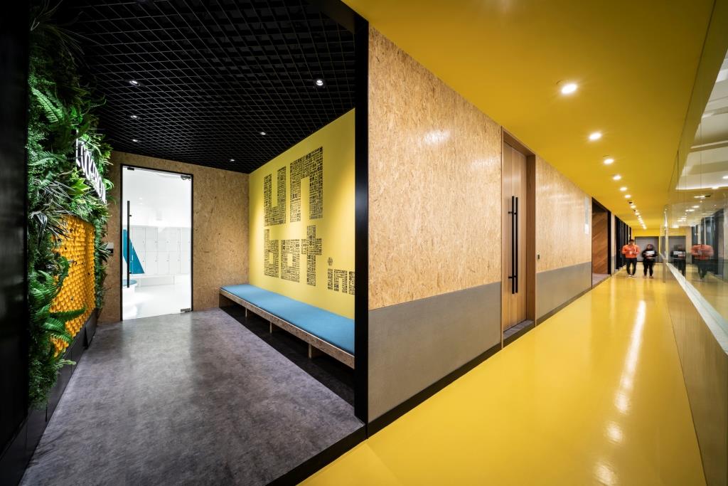 Al giallo si alternano poi il grigio, in diverse sfumature, il bianco e il nero, i toni del blu e del verde, l’oro delle lampade, il legno di arredi e rivestimenti e l’intricata texture dei pannelli. L’effetto complessivo è di un luogo vivace e dinamico, libero dagli schemi, dove creatività e socialità sono gli elementi cardine, al centro del workspace.