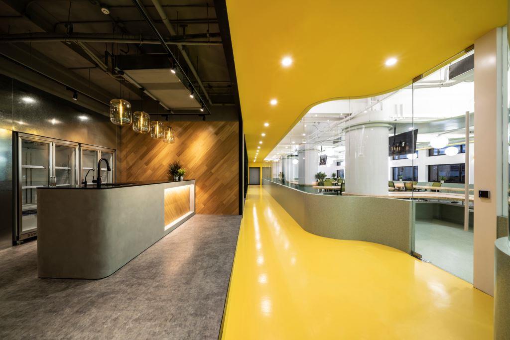 Ed è proprio il corridoio con le sue trasparenze e le sue curve a riassumere il concetto chiave del progetto. Un percorso di un vivido colore giallo, ispirato alla luce solare necessaria per la fotosintesi nei cloroplasti, che con la sua vivacità e unicità si accosta perfettamente agli ambienti operativi più seri ed eleganti e diventa uno degli elementi rappresentativi di Unbot, tanto da espandersi anche nella zona di ingresso per accogliere il grande logo nero del brand.