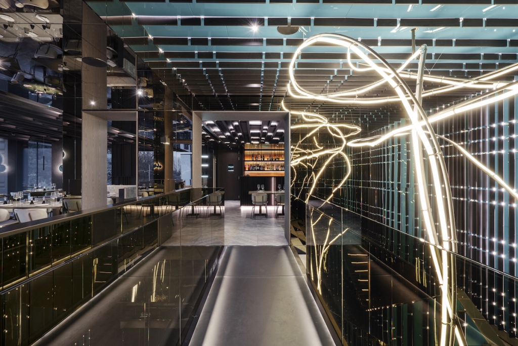 La sinergia tra architettura, design e gesto artistico, che caratterizza il lavoro di Maurizio Lai, trova emblematica rappresentazione in una installazione luminosa all’ingresso del ristorante. Firma tridimensionale, stringa di energia fluida e rampicante che attraversa lo spazio, domina la hall sviluppandosi in altezza fino al piano superiore e introduce un tema di dinamismo e verticalità.