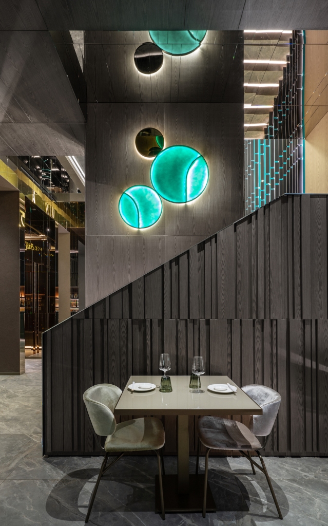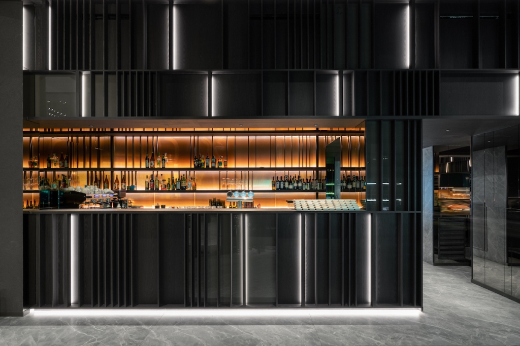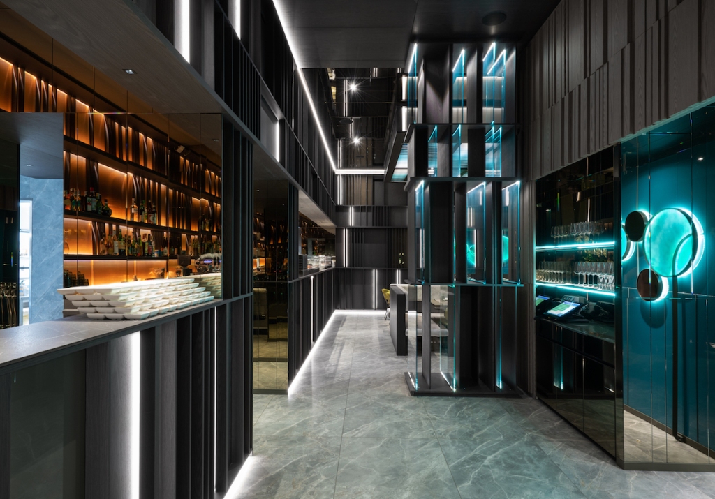 Gli spazi di degustazione, sviluppati su due piani, sono caratterizzati da un racconto cromatico che ai toni scuri dei rivestimenti contrappone elementi in vetro e tratti luminosi. La luce emerge come segno progettuale distintivo e i numerosi elementi progettati su misura amplificano l’esperienza visiva, combinando retroilluminazione, proiezione e illuminazione a incasso al rivestimento materico, ligneo e vellutato, oppure ceramico e vitreo.