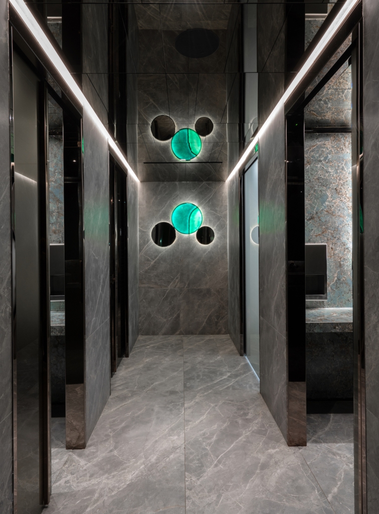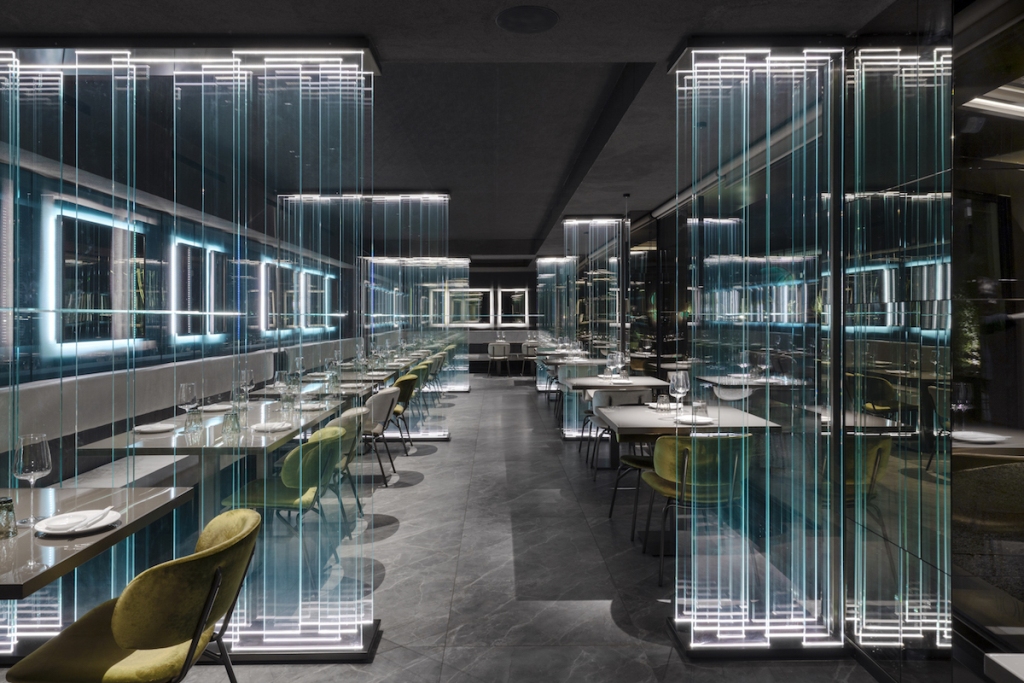 I soffitti propongono il motivo della scansione geometrica su disegno, a effetto parametrico, declinata nei differenti ambienti con materiali diversi, cadenzati da effetti di luce soffusa. I pavimenti sono in gres effetto pietra, panche e sedute hanno struttura in ferro verniciata a polvere, con rivestimenti in tessuto. Nella sala al piano terra – che affaccia sul giardino privato attraverso un’ampia vetrata – le suggestioni naturali vengono amplificate dall’utilizzo del vetro, che Maurizio Lai sceglie per creare una sequenza di elementi separatori illuminati in costa. Mentre le scansioni verticali sono usate per dividere lo spazio con un effetto prospettico diffuso, richiamando i toni acquei delle installazioni luminose a parete.