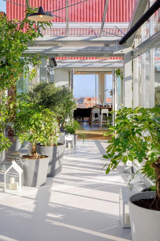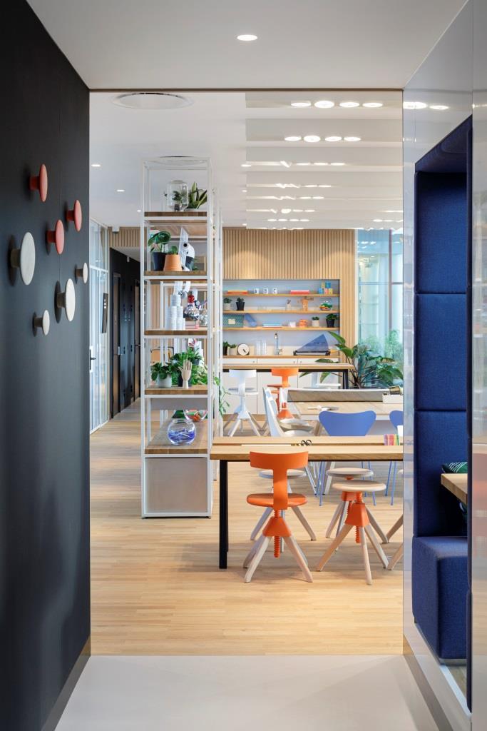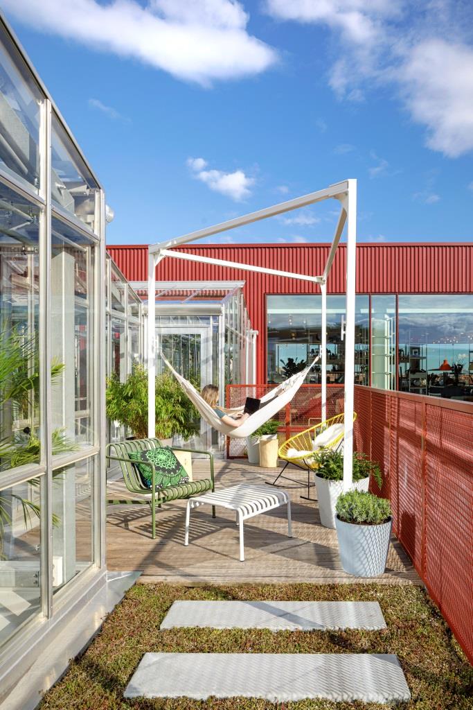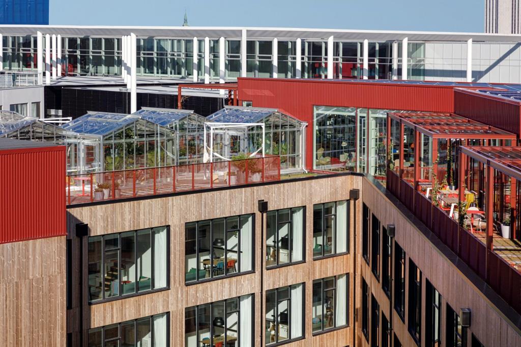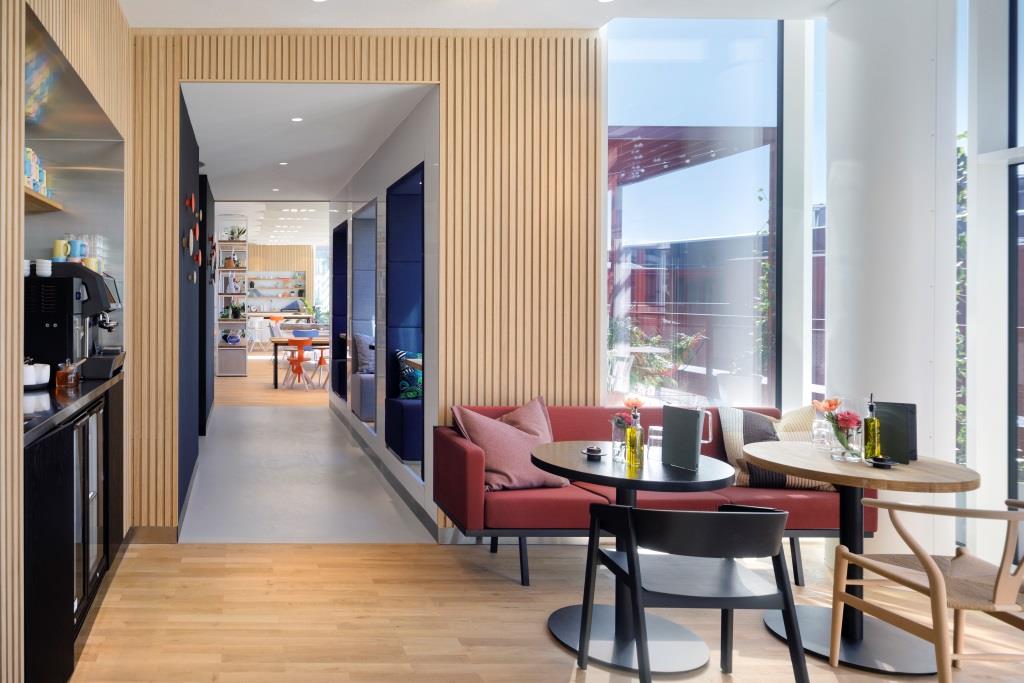 La sala da pranzo con cucina a vista e la lounge sono sul rooftop, abbellito da amache e da un giardino pensile composto da piccole serre, perché il clima del Nord non è sempre clemente. In quota anche l’area coworking e le sale riunione, con splendida vista sulla città. Ovunque il legno chiaro, scelto per i pavimenti e le boiserie, parla il rassicurante linguaggio degli interni nordici e si accosta perfettamente agli arredi contemporanei e colorati, tra cui gli appassionati di design non faticano a riconoscere alcuni pezzi iconici.