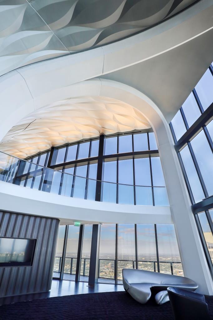 Tra i momenti più seducenti dell’edificio, c’e la piscina in cima coperta da un soffitto obliquo di metallo ondulato che crea l’effetto di una cascata. Da qui si ammira tutta la città, una vista spettacolare la cui luce si rifrange nel gioco di metallo e acqua di questo ambiente.