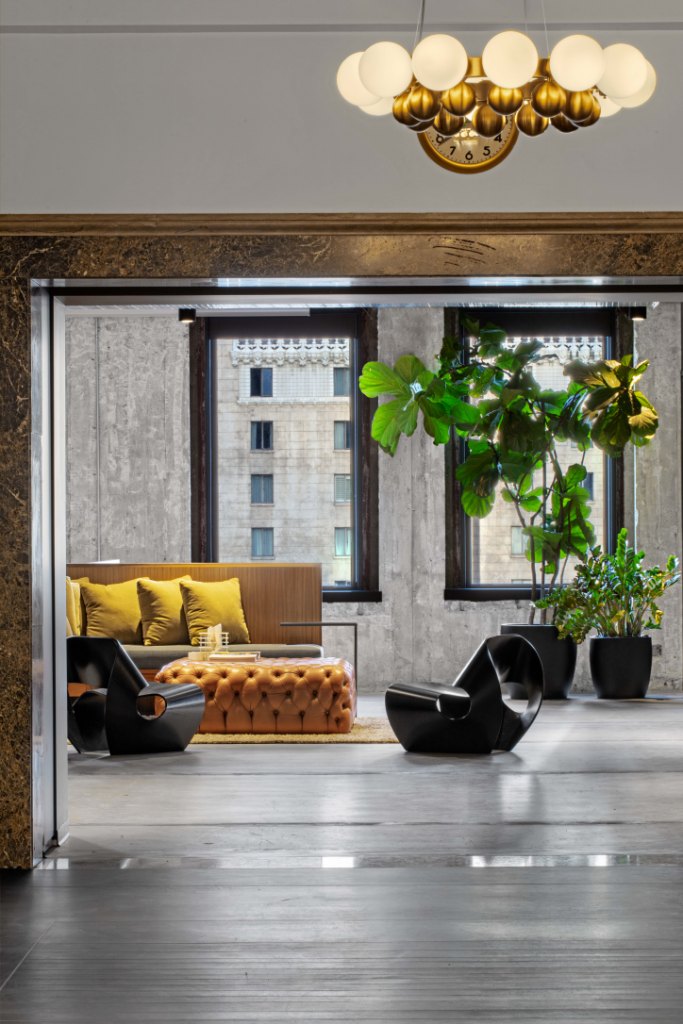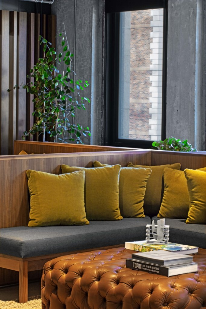 Il linguaggio è duplice, da un lato il cemento a vista e l’acciaio con il brutalismo dell’impiantistica a soffitto, dall’altro materiali pregiati, caldi, come il legno e il cuoio delle sedute dalle forme morbide, e raffinati come l’ottone dei dettagli. All’ingresso una grande lobby con un desk in metallo spazzolato accoglie i clienti, alle spalle doghe in legno a tutta altezza attualizzano il concetto di boiserie. La zona lounge, di attesa per il visitatore ma anche di relax per chi lavora nell’ufficio, è informale ma elegante. In adiacenza si apre una grande sala riunioni perimetrata da pareti vetrate, secondo la logica dell’open space completamente permeabile alla vista. Ma all’occorrenza la sala si può dividere grazie a una parete scorrevole.