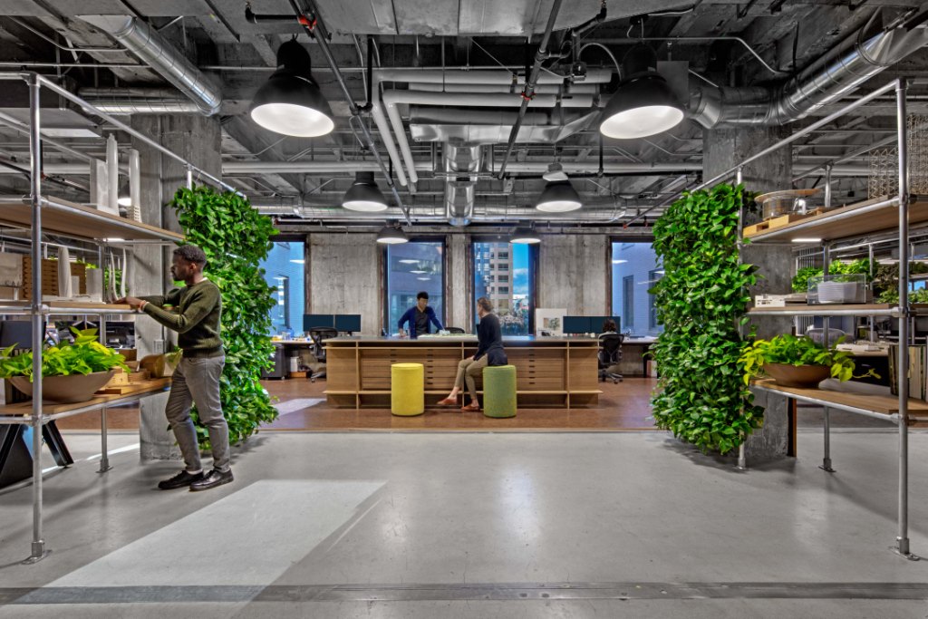 Più che con scrivanie, l’ambiente lavorativo è organizzato con banconi in legno che permettono maggiore flessibilità d’uso per piccoli e grandi gruppi di lavoro. Un’ampia sala, anche questa vetrata, è dedicata alla realizzazione di maquette. Gli spazi sono delimitati da librerie di tipo industriale fatte di assi in legno e tubolari metallici. Ovunque cascate di piante verdi richiamano il colore del logo aziendale oltre a contribuire a creare ambienti piacevoli dall’atmosfera rilassata.