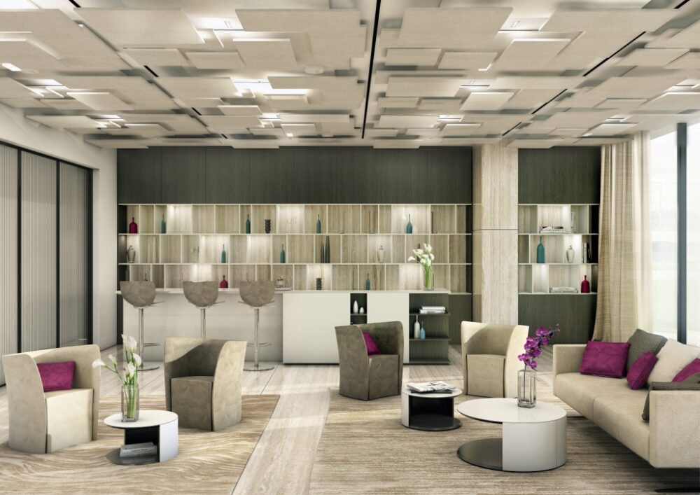 La zona lounge, pensata per la socializzazione e la convivialità, è resa dinamica da un soffitto a quadrotti irregolari che cambia aspetto in base al punto di osservazione, mentre la parete di fondo è definita da un mobile in legno e marmo travertino.