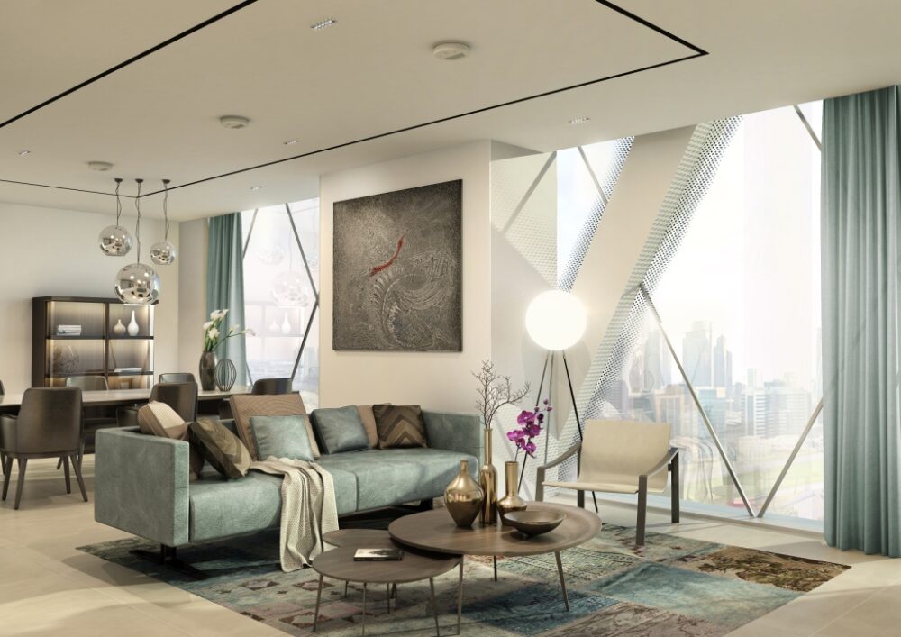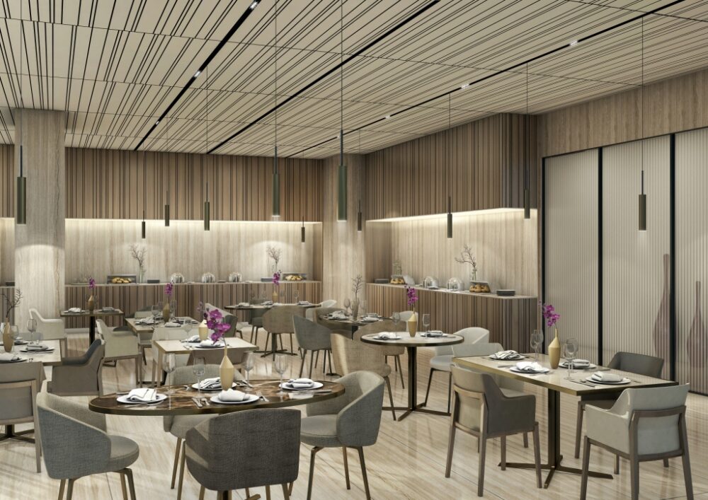 Infine, all’interno del grattacielo ci sarà anche un ristorante, reso elegante dal soffitto rivestito in legno melaminico placcato su MDF nero e con un decoro a strisce irregolari che muovono elegantemente la superficie. Lo stesso decoro geometrico si ritrova anche nei mobili buffet, realizzati in legno di eucalipto con piani in travertino.