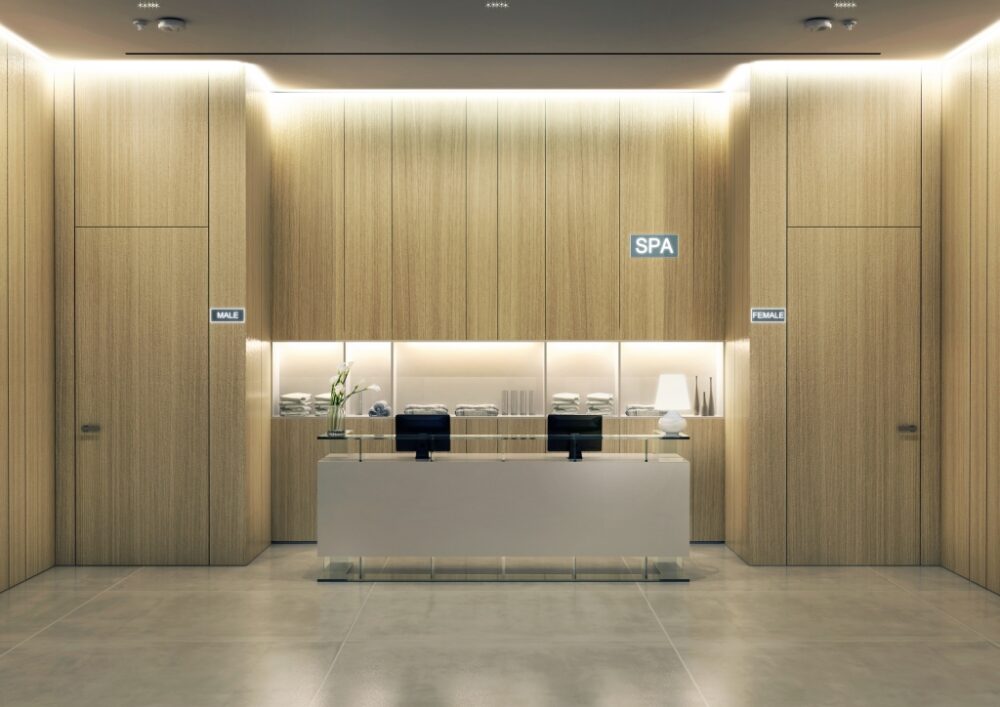 A disposizione dei residenti anche una game room, risolta con mobili in rovere e travertino, un’area fitness con pareti rivestite alternativamente con specchi e boiserie e caratterizzata da un’illuminazione calda, una spa con ingresso rivestito in legno di rovere e interni completamente in marmi calacatta e Carrara.