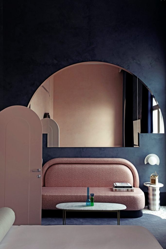 Una narrazione che prosegue nelle camere e suite, ricche di piastrelle smaltate a mano, dettagli in marmo Breccia Capraia e tessuti sontuosi, lampade cromate e preziosi dettagli in ottone. Qui le tipiche pareti in marmorino o in stucco veneziano fanno da sfondo alle importanti e originalissime testiere in legno intagliato: vere e proprie sculture che incredibilmente riescono a mixare l’ispirazione gotica allo stile postmoderno.