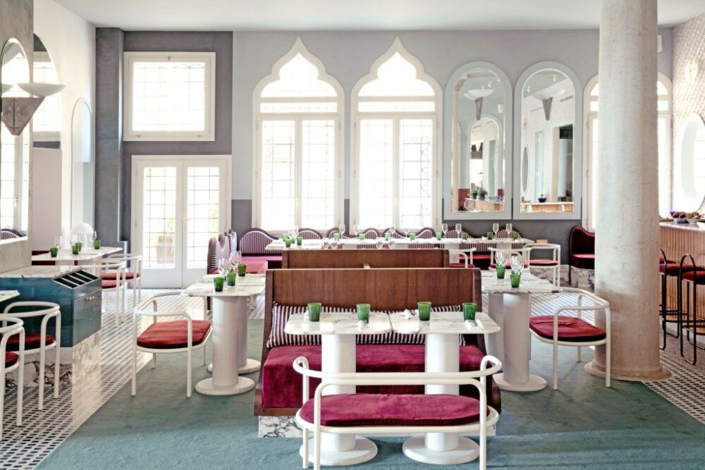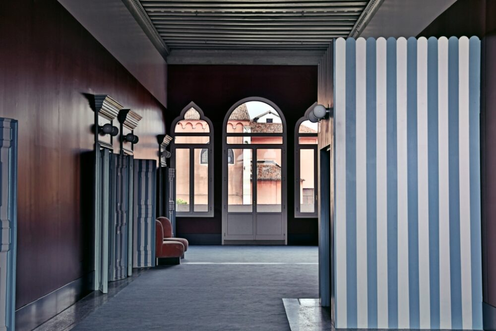 Le decorazioni a righe riprendono le strisce delle maglie dei gondolieri, e ovunque trionfano l’amore per la simmetria di Dorothée Meilichzon, gli amati archi a tutto sesto e studiati dettagli in stile Art Dèco