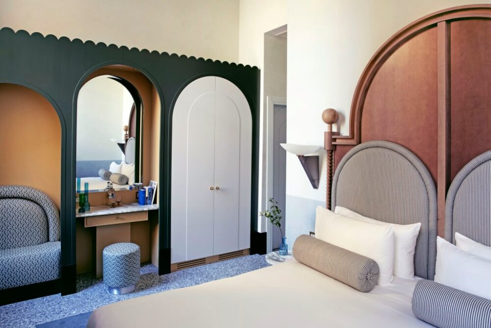 Le decorazioni a righe riprendono le strisce delle maglie dei gondolieri, e ovunque trionfano l’amore per la simmetria di Dorothée Meilichzon, gli amati archi a tutto sesto, i grafismi e studiati dettagli in stile Art Dèco che sono la sua cifra e rendono il suo stile unico e inconfondibile. Tra i piccoli capolavori anche i comodini di alluminio serigrafato ornati da strisce in acciaio spazzolato.
