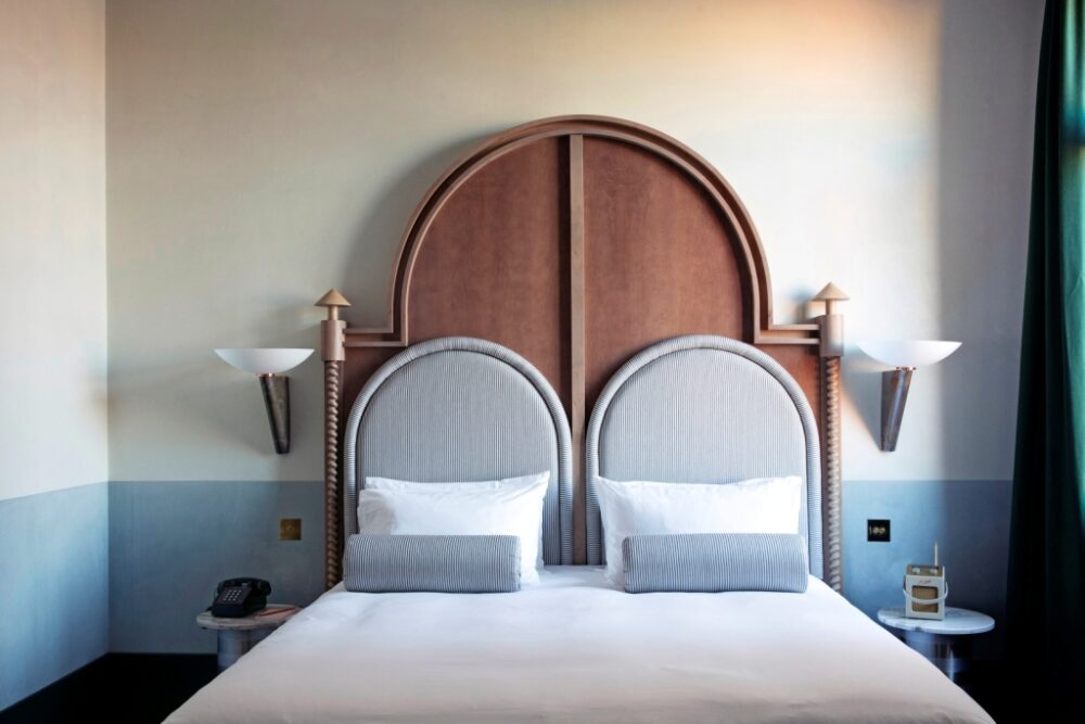 Una narrazione che prosegue nelle camere e suite, ricche di piastrelle smaltate a mano, dettagli in marmo Breccia Capraia e tessuti sontuosi, lampade cromate e preziosi dettagli in ottone. Qui le tipiche pareti in marmorino o in stucco veneziano fanno da sfondo alle importanti e originalissime testiere in legno intagliato: vere e proprie sculture che incredibilmente riescono a mixare l’ispirazione gotica allo stile postmoderno.