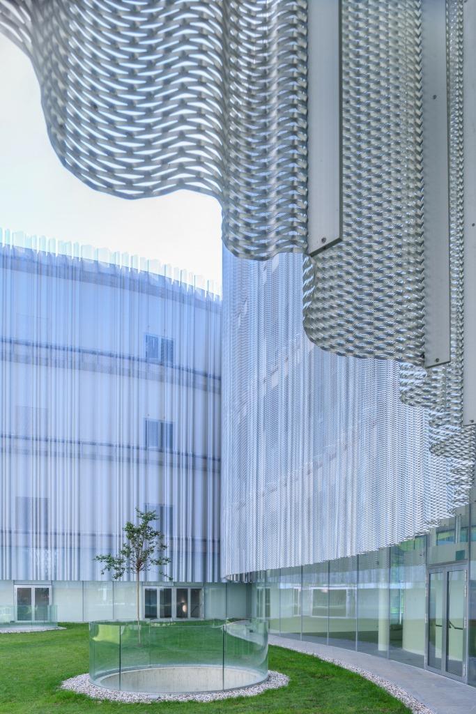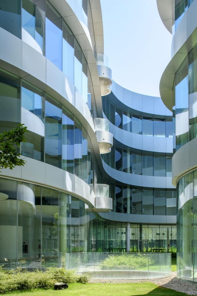 Qui, le facciate degli edifici, dalle linee sinuose, sono caratterizzate da trasparenze che accentuano il concetto di apertura e generano una sensazione di fluidità tra gli spazi interni ed esterni. Il vetro, materiale protagonista, è protetto da superfici metalliche con un effetto visivo di leggerezza e sospensione. Gli edifici disegnano delle corti al centro, formando un ambiente naturale, mentre esternamente si affacciano verso la città e il parco.