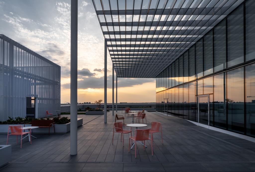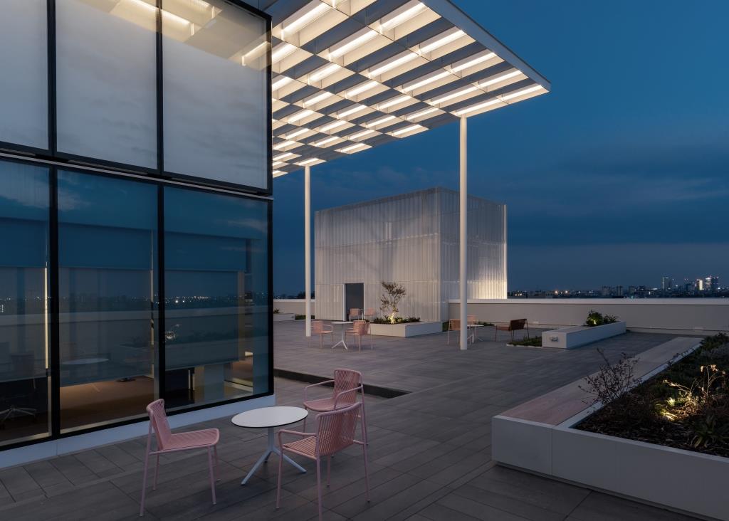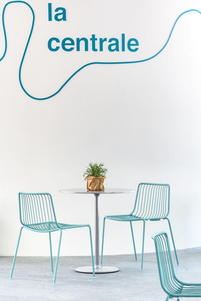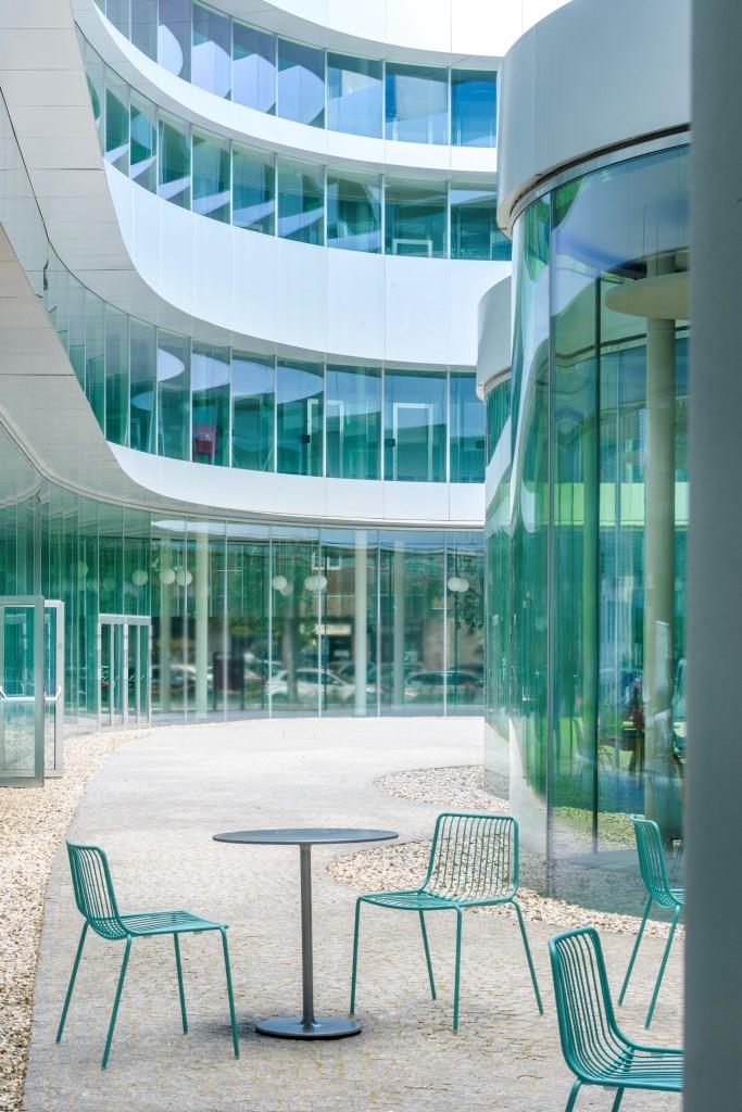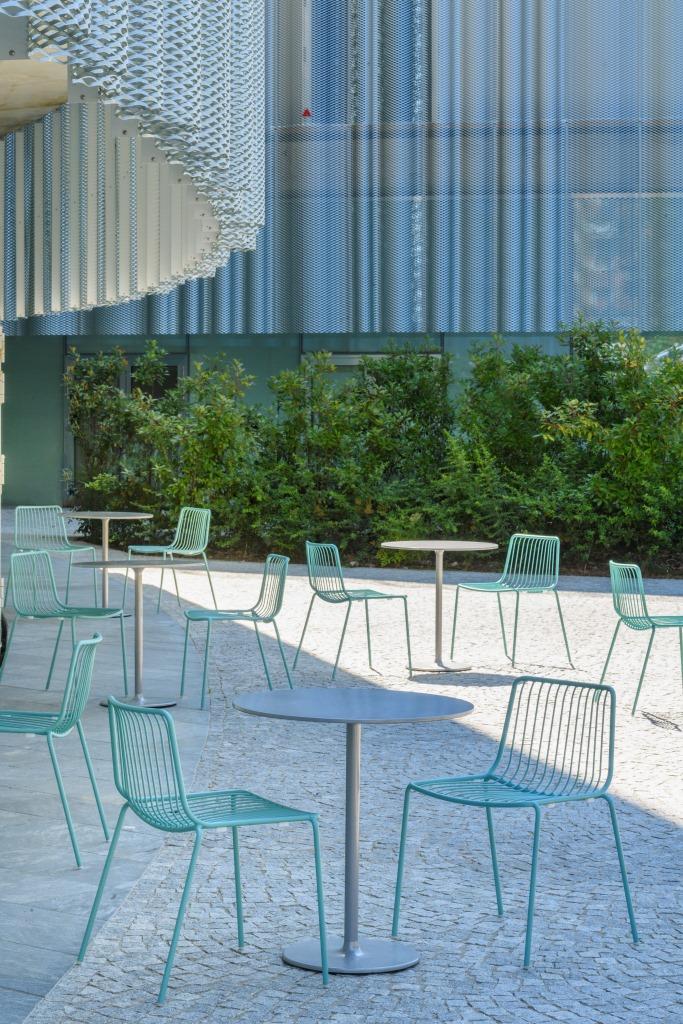 Punto focale dell’edificio è la terrazza panoramica situata al decimo piano, pensata per ospitare eventi esclusivi e meeting all’aria aperta. Qui troviamo la collezione Tribeca di Pedrali, che si inserisce in questo spazio sospeso tra cielo e terra, riparato da un tetto a sbalzo, che ricorda un giardino pensile dove i colori dei materiali e delle piante giocano con la luce. Disegnata da CMP Design, Tribeca è una reinterpretazione in chiave moderna delle classiche sedute da terrazza Anni 60 realizzate in acciaio con intreccio. Un’icona rivisitata attraverso nuovi materiali: un solido telaio tubolare unito all’elasticità di un profilo in materiale plastico ordito verticalmente che si contraddistingue per la sua natura durevole, pulibile e colorata. A fianco di sedie, poltrone e divanetti Tribeca sono poi abbinati i tavoli Elliot di Patrick Jouin, dalla silhouette elegante e dalle forme delicate e slanciate.