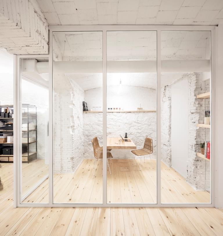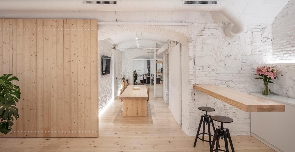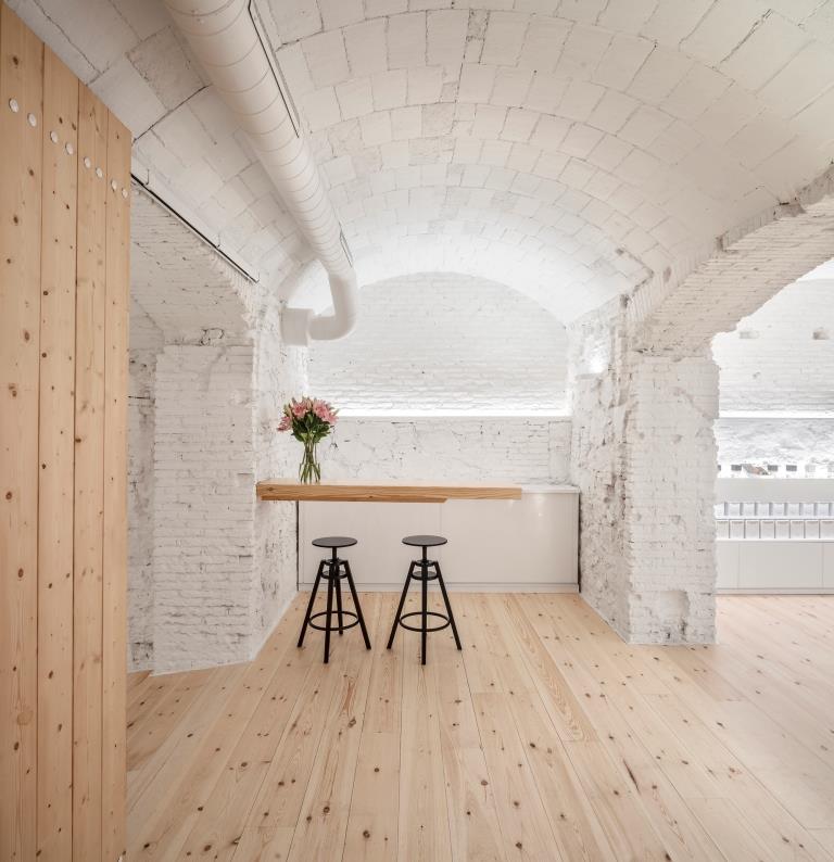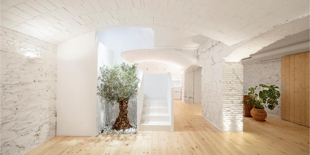 Con accesso dalla strada, i 150 metri quadri del locale si sviluppano quasi esclusivamente a quota interrata, dunque in un ambientazione ipogea, che indirizza le scelte dei progettisti verso un approccio non scontato. L’intervento, infatti, conserva e mette in evidenza gli elementi preesistenti originali dell’architettura catalana tradizionale: muri in mattoni e pietra e soffitti a volta, rendendoli uniformi con il bianco della calce.