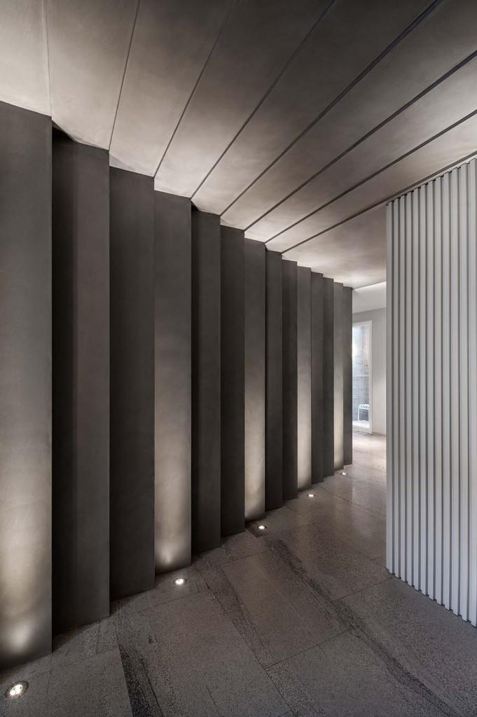 Lo stesso concetto è ripreso dall’ingresso, una sorta di cannocchiale che si addentra fluidamente negli interni attraversando un’intima hall e una accogliente biblioteca in una suggestiva transizione non solo spaziale ma anche concettuale, che trasporta gli ospiti in una differente dimensione temporale. Gli interni del piano terra si articolano lungo l’asse di un ampio corridoio centrale, ai cui lati trovano spazio intimi ambienti dedicati alla lettura e allo studio le cui geometrie essenziali e i colori tenui favoriscono la concentrazione e la focalizzazione mentale.