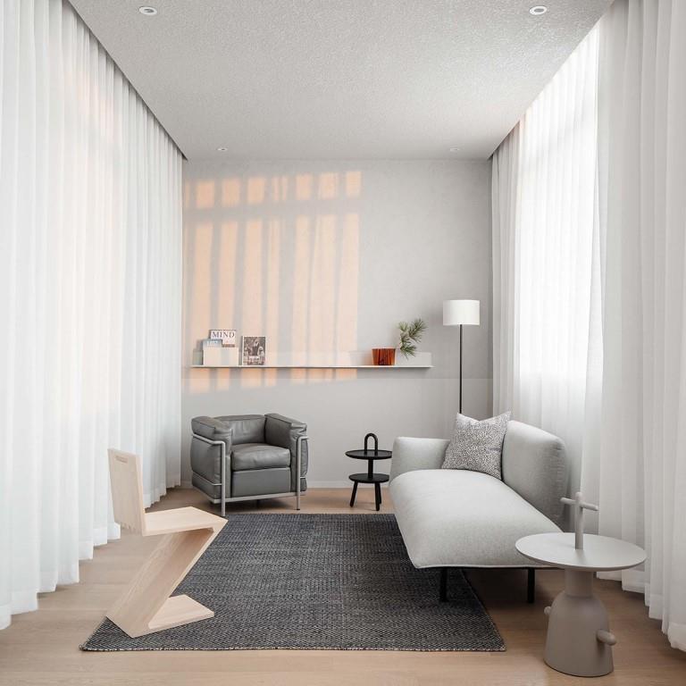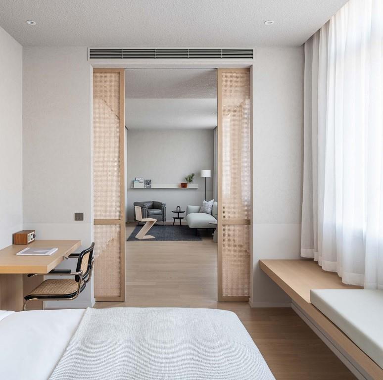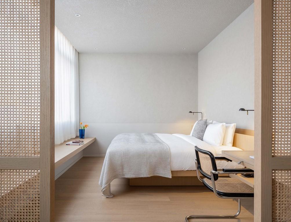 Atmosfere discrete che ricorrono in tutti gli ambienti di un hotel fatto di spazi dilatati, discretamente delineati all’insegna di una leggerezza che connota non solo le architetture ma anche una palette di colori tenui e le texture naturali del legno e della pietra. L’esito è un mood intimo e rilassante che connota con una personalità morbida ma al tempo stesso decisa gli spazi privati delle camere, declinate nelle tonalità del grigio chiaro riscaldate dal rovere naturale degli arredi e dall’ottone delle finiture.
