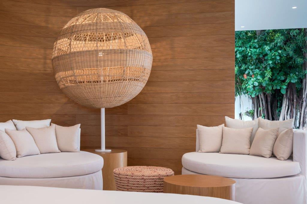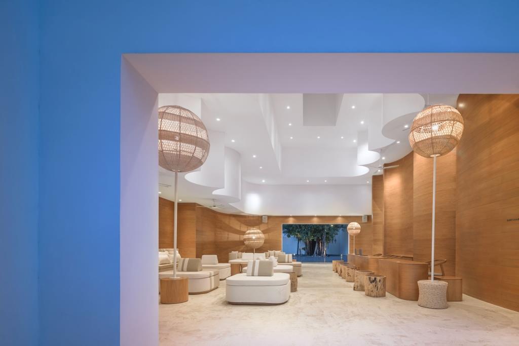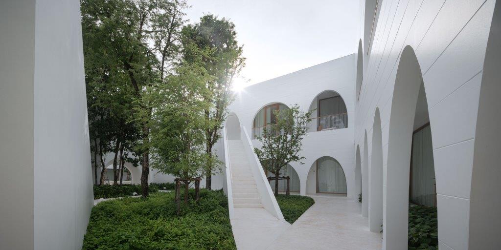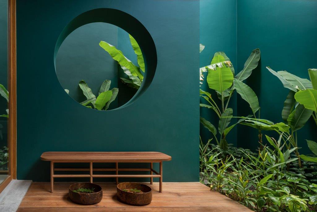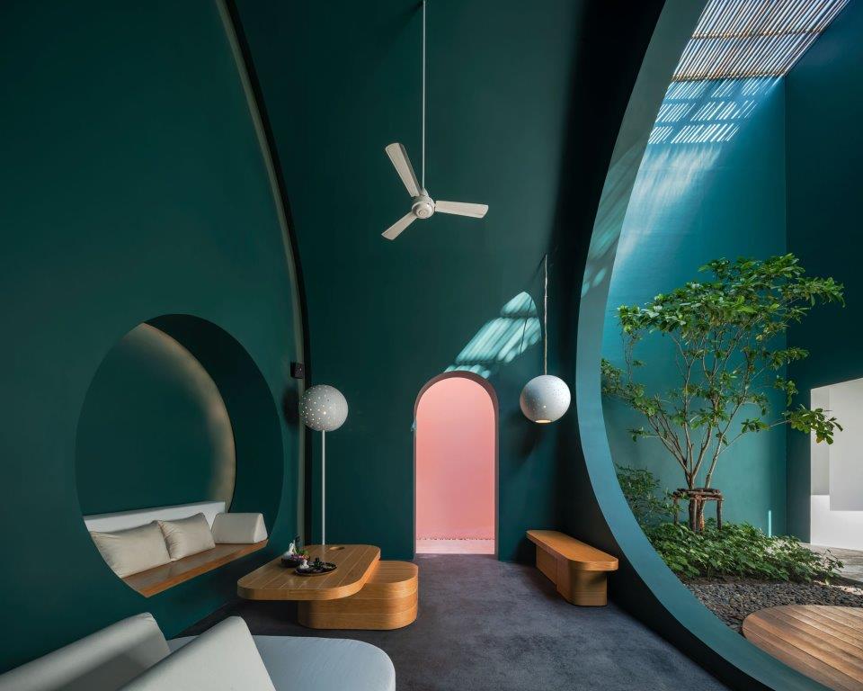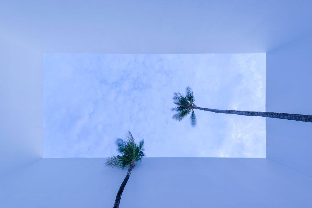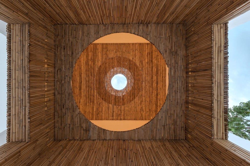Dichiarata la volontà da parte dei progettisti di attirare l’attenzione degli ospiti anche verso il cielo: la transizione tra le cinque corti principali avviene tramite vuoti di forma, dimensioni e materiali diversi, dai layer sovrapposti di bambú ai tagli ovali ricavati nel cemento armato della soletta.