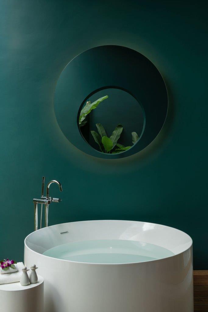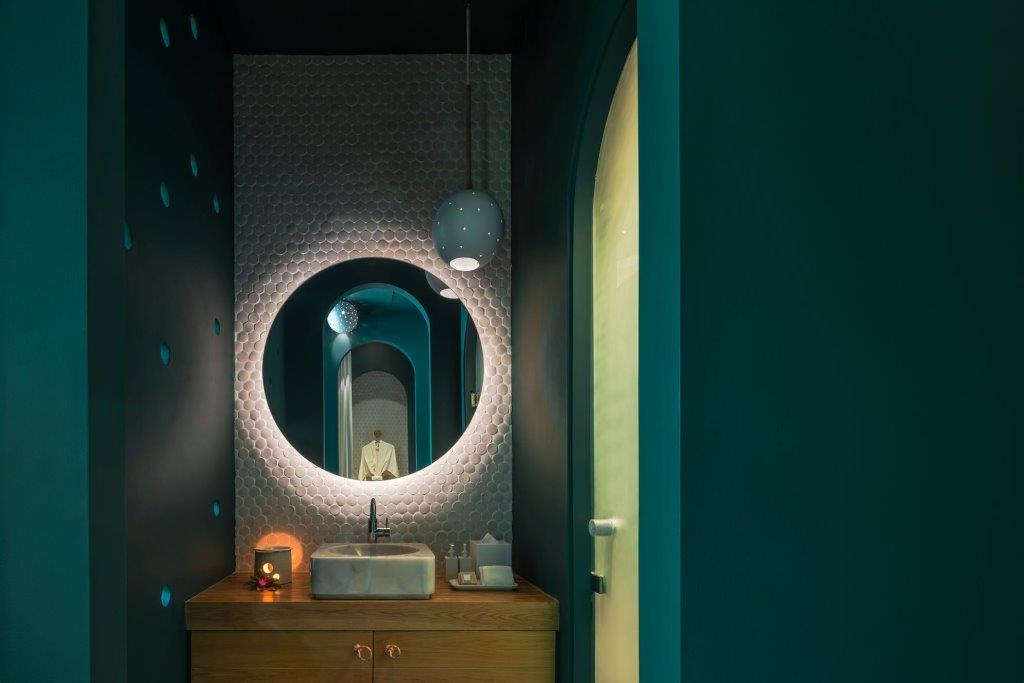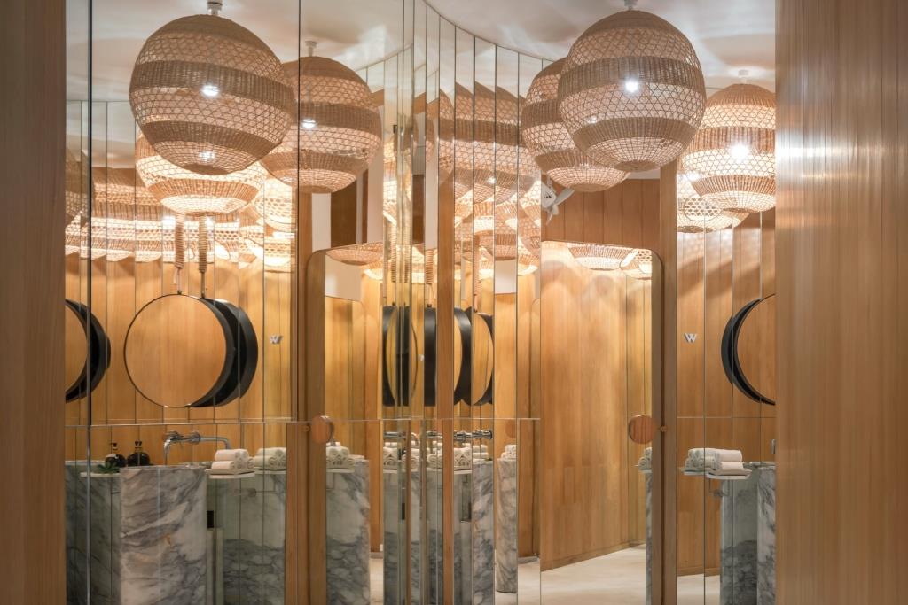 Il bianco dominante è interrotto solo nella zona spa, dove il verde e il rosa delle superfici creano un’esperienza spaziale diversa e sorprendente, anche grazie ai giochi d’ombra che si proiettano sulle forme concave e convesse degli spazi.