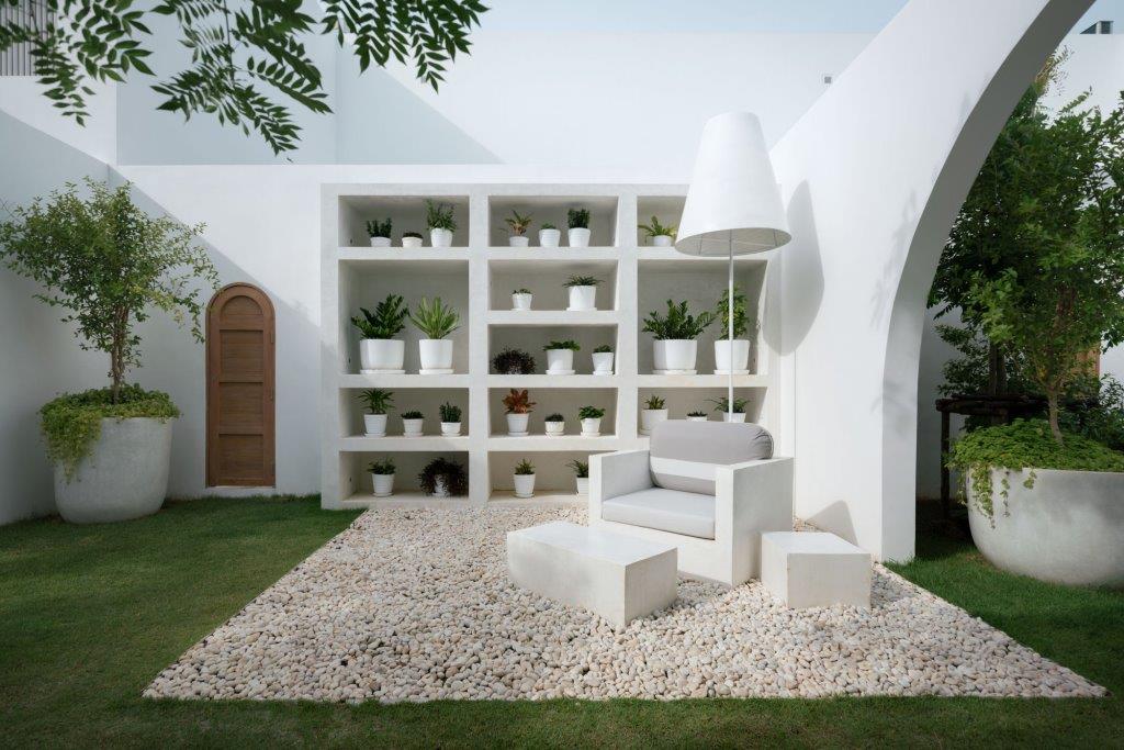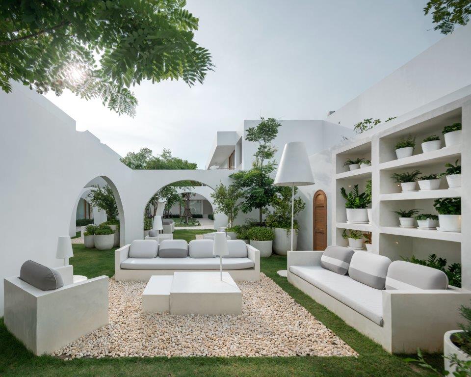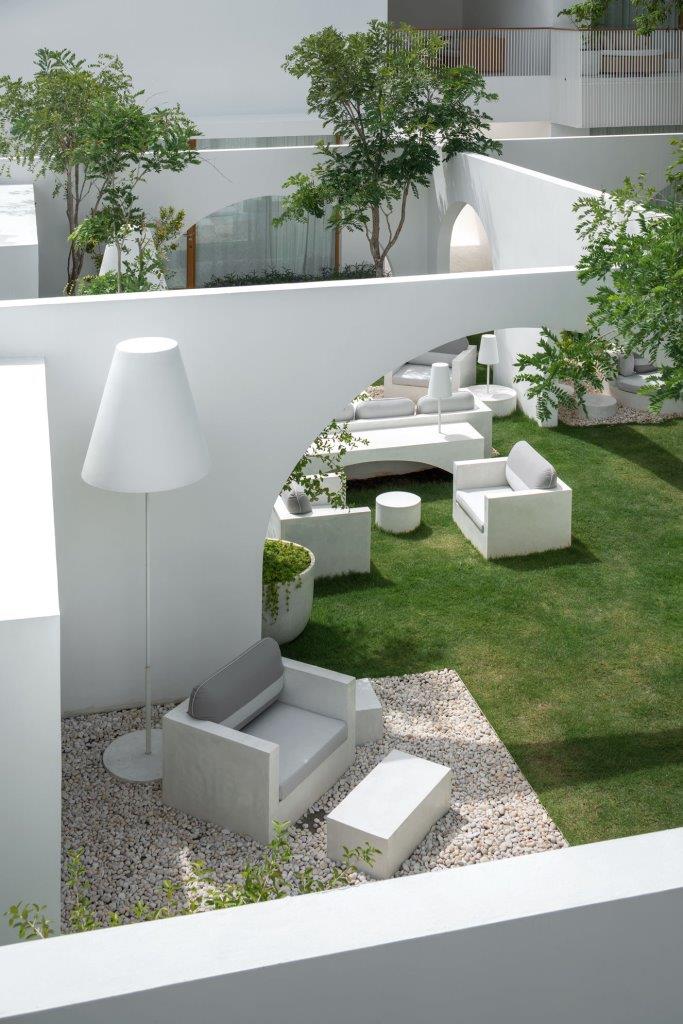 Importante a questo proposito per il concept l’osservazione della luna, nelle sue fasi, che guida nel disegno di spazi che alternano sequenze di luce e ombra, vuoti e pieni che interrompono e dinamizzano le pareti bianche che caratterizzano l’architettura del resort.