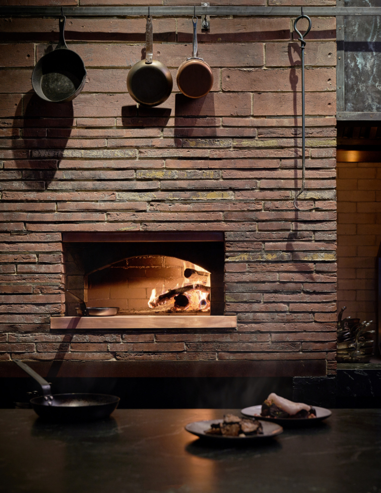 I circa 40 posti del Samara sono gestiti attraverso un mix di sedute che spazia dai comodi divanetti in pelle agli sgabelli disposti intorno al grande bancone in pietra ollare della cucina e accentuano l’atmosfera informale del locale. Tocchi suggestivi arrivano dal rame ossidato che riveste la parte superiore del forno e dai mattoni a mano, nel cui impasto sono dispersi piccoli frammenti di vetro fuso che creano suggestivi giochi di luce.