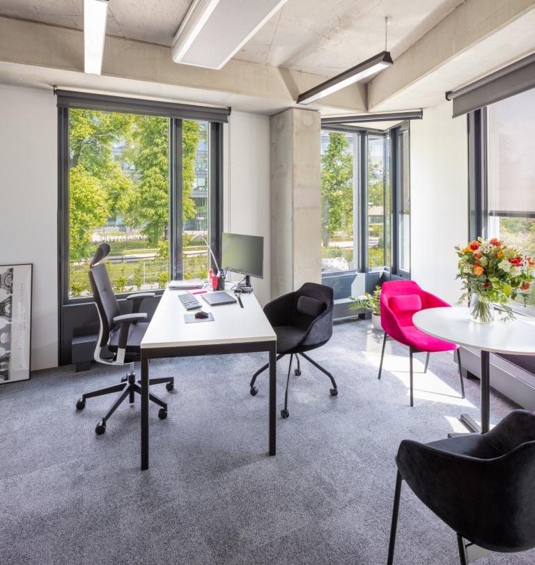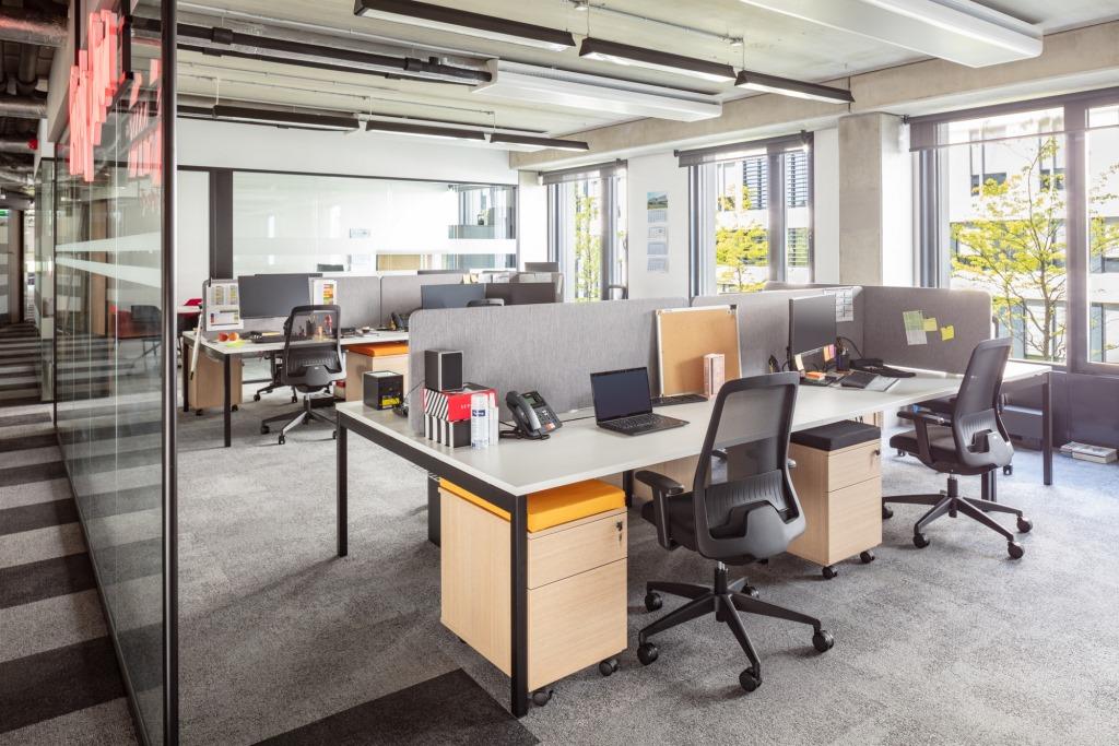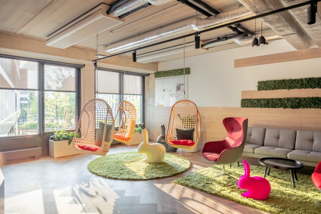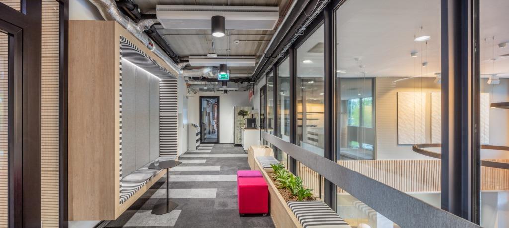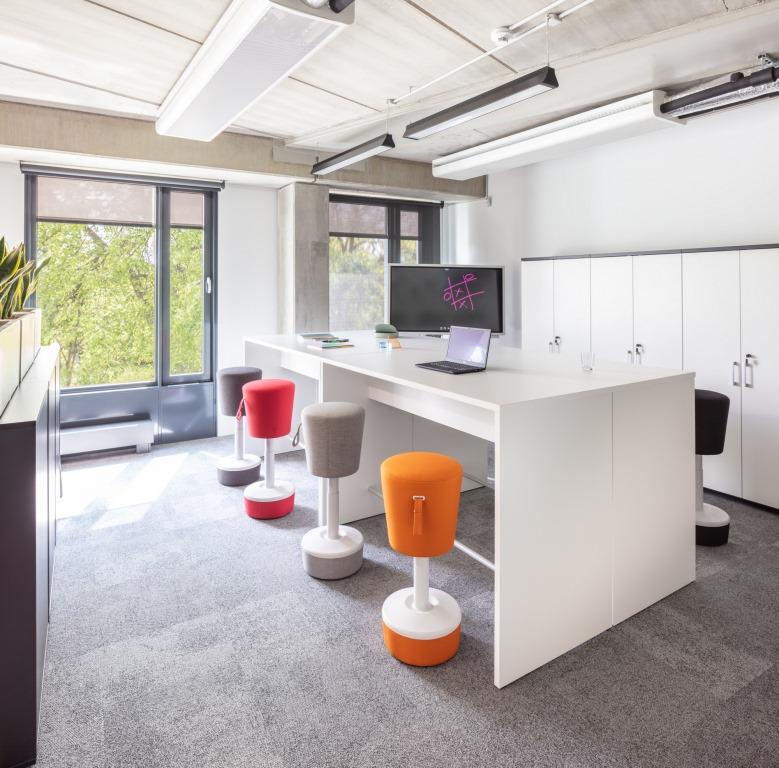 Le comode postazioni di lavoro trovano spazio in accoglienti ambienti open space dai colori tenui, alternati alle tonalità vivaci dei pannelli decorativi a parete e delle sedute.