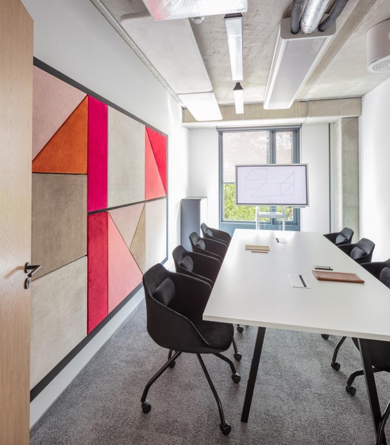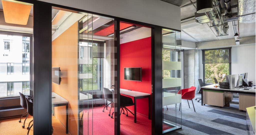 Il dialogo cromatico fra la neutralità del bianco di tavoli e pareti e le vivaci tonalità del rosso e del rosa ricorre anche nelle sale riunioni dedicate al lavoro dei team creativi, luminose e aperte, come anche negli uffici privati, dove il tema del colore trova continuità grazie all’utilizzo di partizioni vetrate.