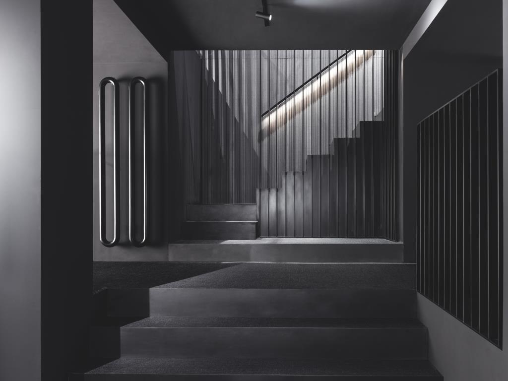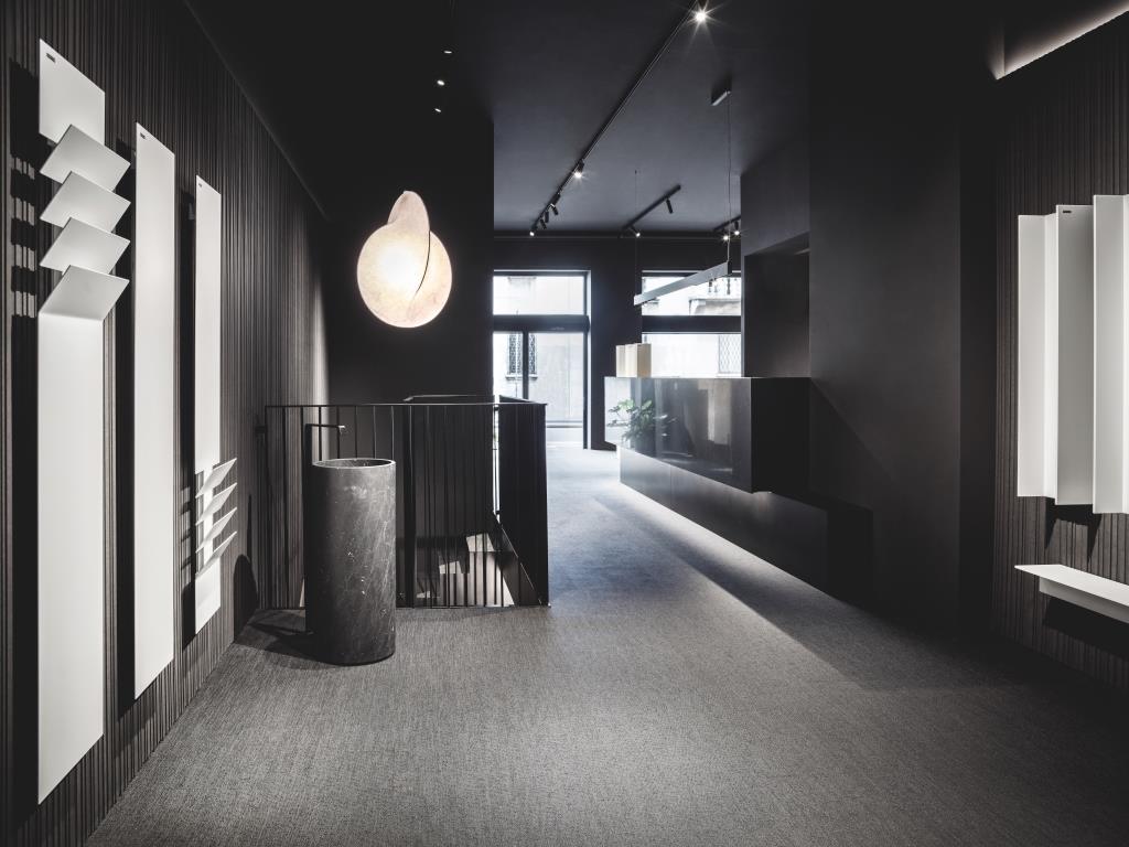Uno spazio di oltre 180 metri quadrati su due livelli progettato da Victor Vasilev come uno sfondo nero continuo e connotato: le pareti sono parzialmente rivestite da una boiserie che crea profondità e una geometria di luci e ombre, su cui diventano protagonisti i radiatori, proposti nella stessa tonalità di nero o in colore bianco opaco.