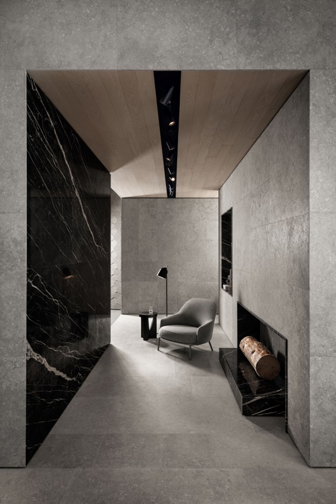Infine, l’ultimo volume è dedicato alla zona meeting delimitata da una maestosa parete dall’abbagliante impatto scenografico. Alta più di quattro metri e costituita da varie declinazioni di Pietra di Vicenza in tutte le finiture su uno sfondo Grigio Argento rullato, la parete è illuminata da una luce calda e radente che ne accentua l’effetto e ne valorizza le affascinanti inclusioni fossili.