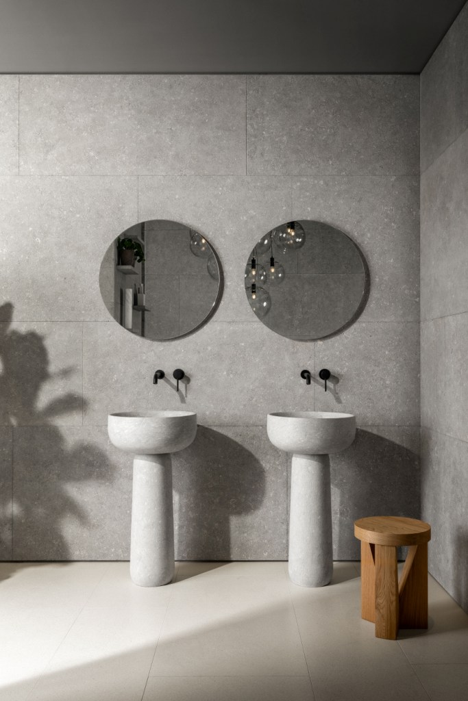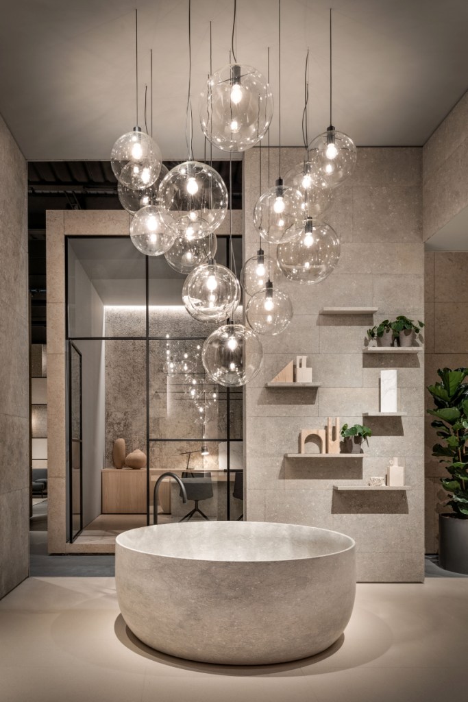 Il primo volume è dominato da una grande vasca ricavata da un unico blocco di Pietra di Vicenza Grigio Alpi e da una coppia di lavabi freestanding, mentre sulla parete color Grigio Argento una serie di mensole esce dagli interstizi ricavati da un pattern di posa irregolare. E dal soffitto pende un grappolo di lampade in vetro soffiato che creano uno scenografico gioco di luce.