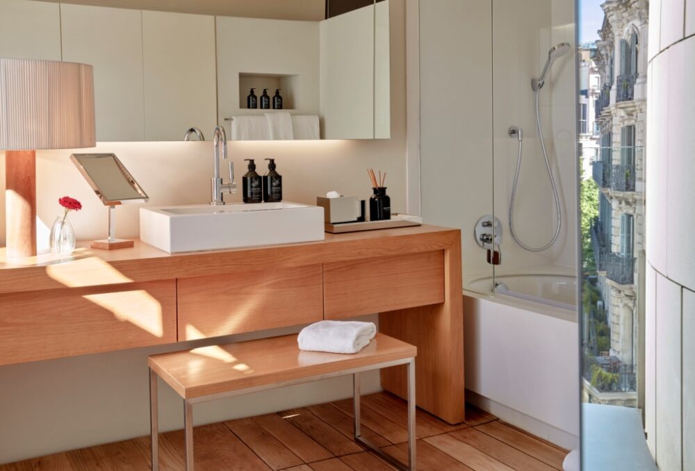 Il concetto di paesaggi che contrastano tra loro prosegue poi nel resto dell’hotel e nelle camere. Qui, una palette di colori neutri e mobili in legno di B&B Italia e Cassina danno lustro a cultura e artigianato locali, mentre i tappeti fatti a mano di Nani Marquina dialogano con i dipinti astratti dell’artista Bernat Daviu.