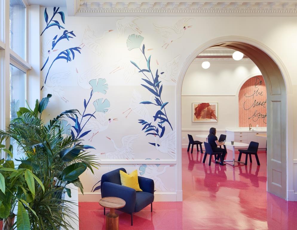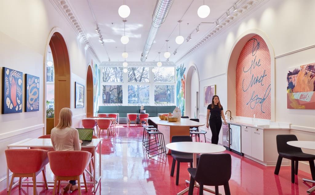 Il coworking per donne di Studio BV è un micro-cosmo rosa, con mobili morbidi, colorati e flessibili. Alle pareti murales e opere d’arte sottolineano il valore dell’inclusività