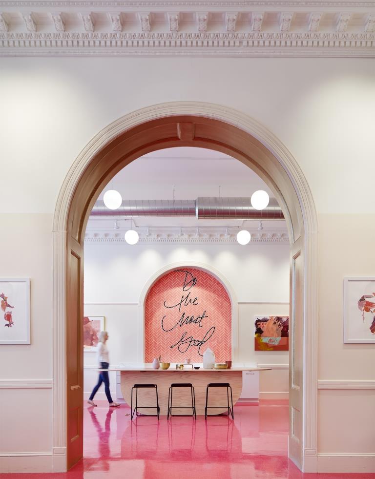 All’ingresso si viene accolti da un bancone reception insolitamente imbottito e di un intenso colore blu, oltre si apre la zona bar con un bancone essenziale e la scritta motivazionale “do the most good” realizzata a mosaico sulla parete di fondo.