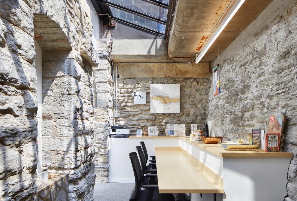 I dettagli più interessanti, tra cui le cornici di gesso a soffitto, i corrimano in ghisa delle scale e gli archi decorati che collegano le stanze, sono stati recuperati. E molte pareti sono state lasciate “nude”, con le pietre originali e gli irregolari mattoni a vista, per sottolineare la storicità dell’edificio.