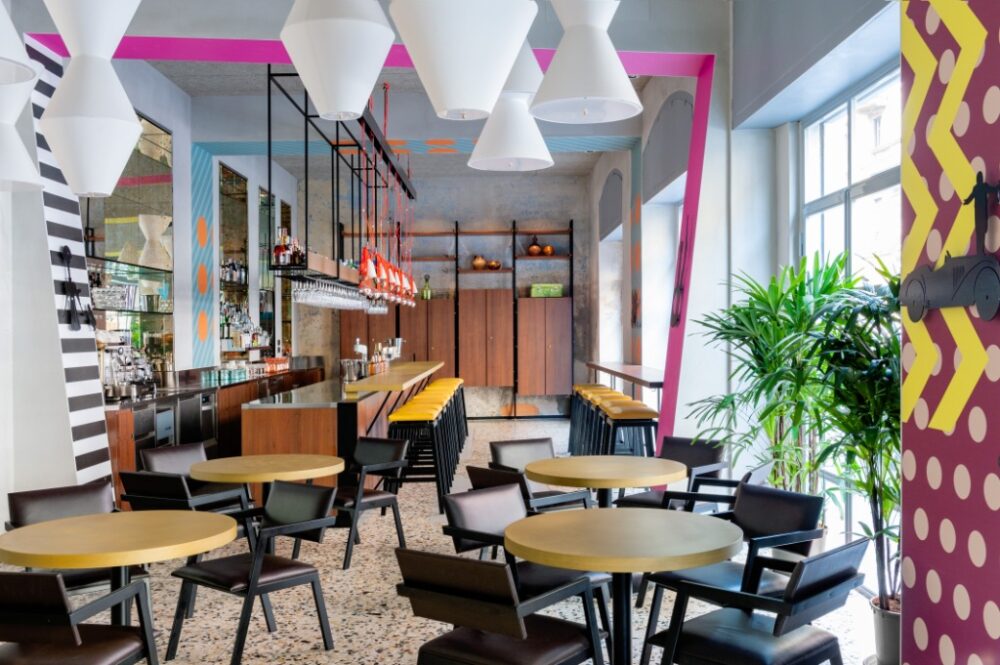 La rilettura degli spazi ha inizio dalle sei vetrine affacciate sulla strada: completamente apribili conferiscono respiro e luminosità all’ambiente, creando continuità fra l’interno e l’esterno. A ognuna di esse corrisponde una tenda colorata, preludio del vivace universo cromatico che caratterizza l’interno. I clienti sono accolti da un imponente bancone che si ispira ai bar milanesi anni ’60 con uno sfondo di vetro anticato, piano in ottone polverizzato e lunga bottigliera sospesa per la cocktail station. A seguire la zona lounge che si compone di quattro tavoli rotondi, realizzati su disegno, con la medesima finitura del bancone, mentre le poltroncine, così come gli sgabelli del cocktail bar, rappresentano un omaggio a Franco Albini, rievocando la sua celebre sedia Luisa.