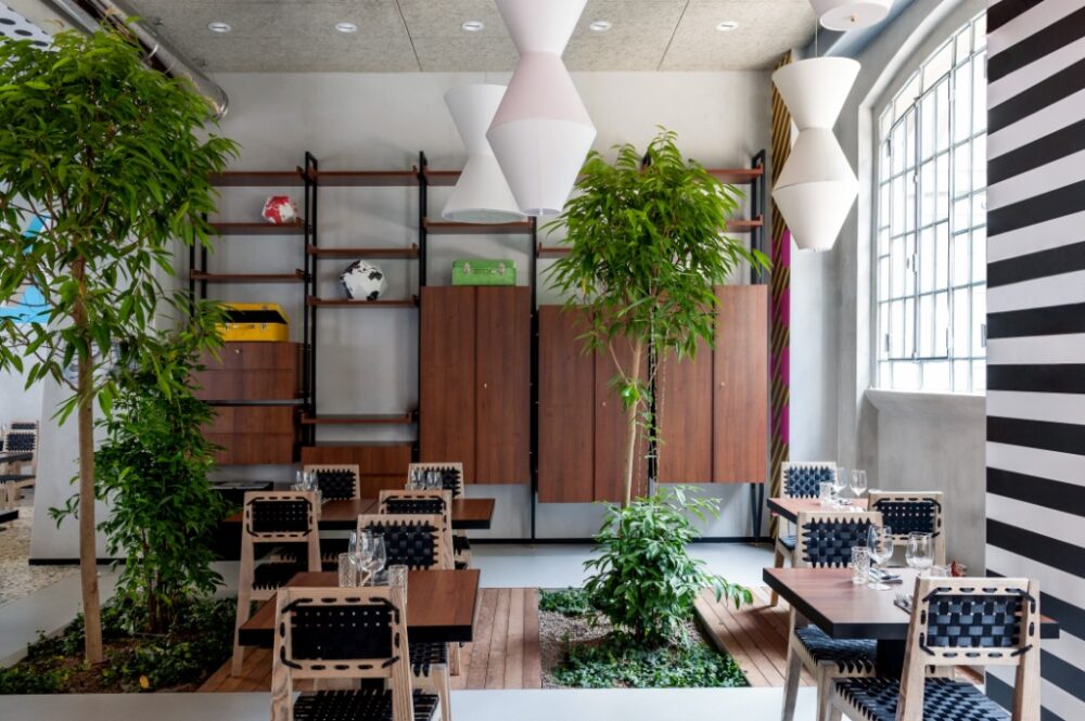 La sala ristorante si caratterizza per una disposizione estremamente flessibile dei tavoli ed è arricchita da grandi lampade realizzate su disegno di Andrea Anatasio che rievocano la forma di strumenti agricoli tipici indiani, mentre il mobile adibito a service station crea un suggestivo angolo con il pavimento in legno e le piante su ghiaia, dando la sensazione di trovarsi in un piccolo giardino. Su colonne e pareti le opere di Jaco Sieberhagenc: l’artista sudafricano ha realizzato una serie di sagome in metallo verniciato nero e tagliate a laser, che rappresentano con ironia i simboli della cultura italiana, dalla moda al design, dall’industria alla gastronomia.