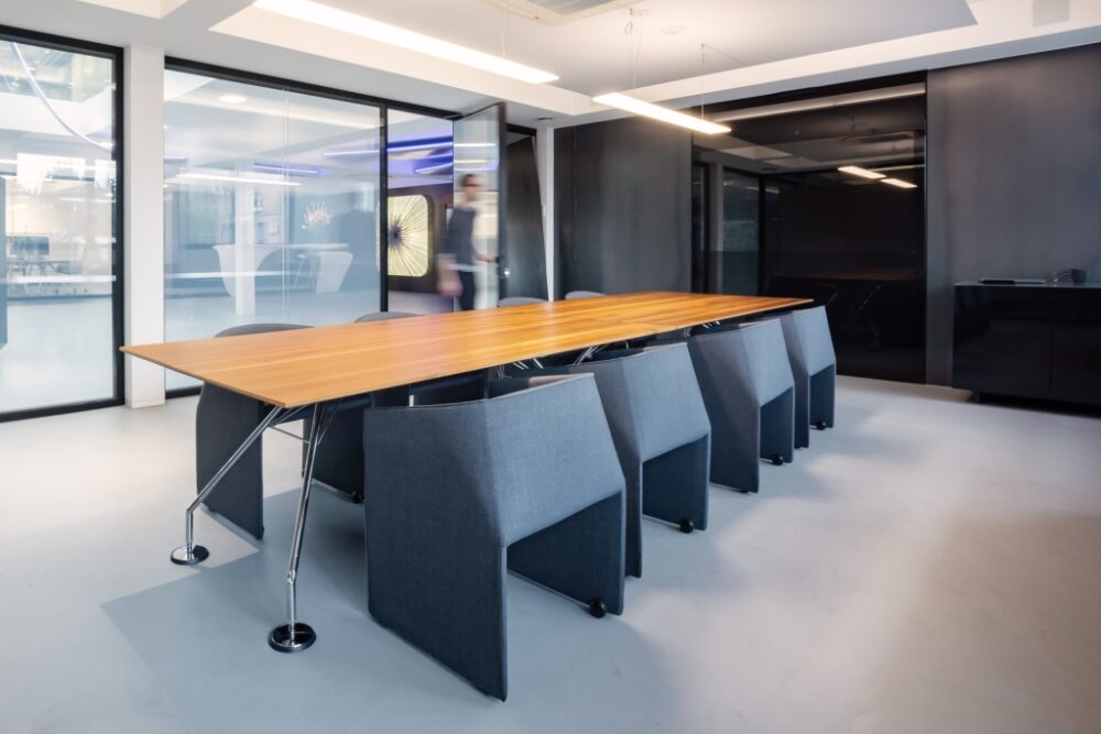 Nelle diverse meeting room, pensate per riunioni plenarie o dedicate a scambi più ristretti e informali, le comode poltroncine Plau sono disposte attorno ai tavoli Nomos con piano rettangolare in legno o rotondo in finitura laminata. In particolare, questi ambienti sono attrezzati con Io.T-The Intelligence of Tecno, la tecnologia introdotta per connettere gli arredi con il building, che permette la prenotazione e la gestione delle sale, oltre al collegamento internet, server e cloud per condividere documenti e presentazioni.