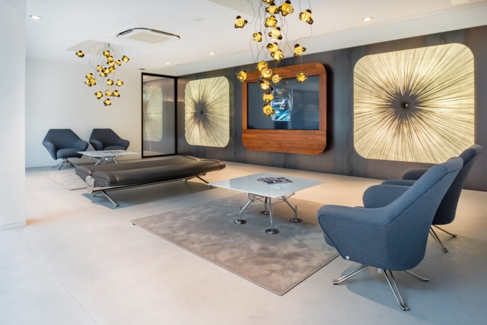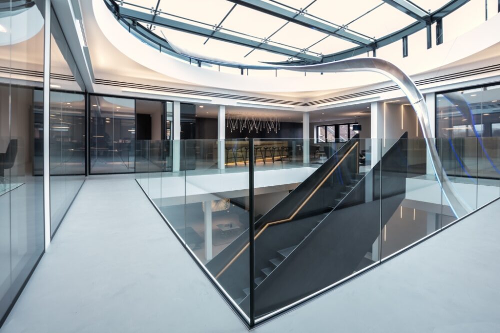 Wolf Oil Corporation è produttore di lubrificanti, tra i player principali del settore a livello mondiale. Per disegnare e perimetrare gli spazi del nuovo headquarter progettato dallo studio olandese Cosmas Design, Tecno ha installato 130 metri quadrati di pareti divisorie W80 vetrate in finitura Elox nero – scorrevoli e a battente – che introducono in ambienti allestiti con arredi dell’azienda, sia di serie che custom.