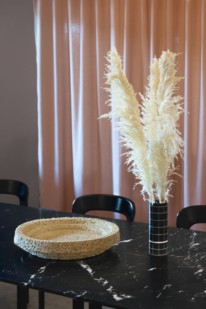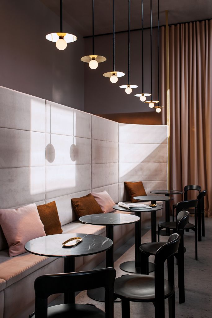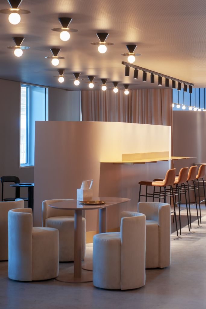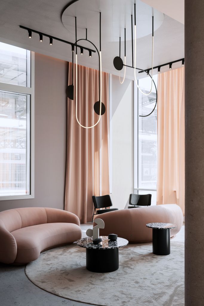 Una luce che enfatizza i colori e le texture di materiali tattili e suadenti. Piccoli e avvolgenti divani, soffici tappeti circolari, voluttuosi velluti, luci gioiello al neon e una palette di colori morbidi e caldi: dal rosa cipria e polvere a tonalità più intense come cognac e terracotta, a mitigare il freddo brutalismo delle pennellate grigio cemento che fanno da sfondo a questa sorprendente scenografia.