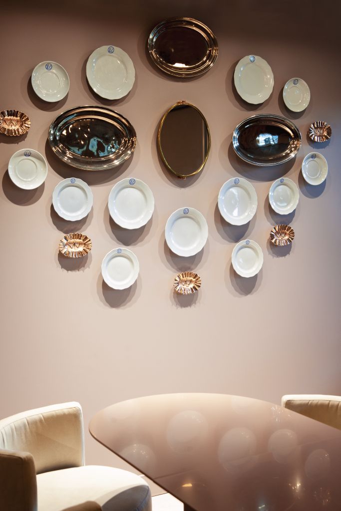 Inatteso e mai banale anche il mosaico degli arredi selezionati da Studiopepe: romantici elementi vintage, iconici pezzi del design italiano – la lampada Atollo di Magistretti, le poltrone Sancarlo di Castiglioni e le sedute Boomerang di Rodolfo Bonetto – sono affiancati da componenti disegnati ad hoc per l’hotel. Tra questi spiccano originali e delicati loveseats e un grande chandelier che sovrasta la zona living, scultoreo e imponente.