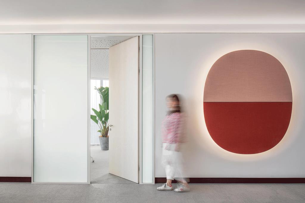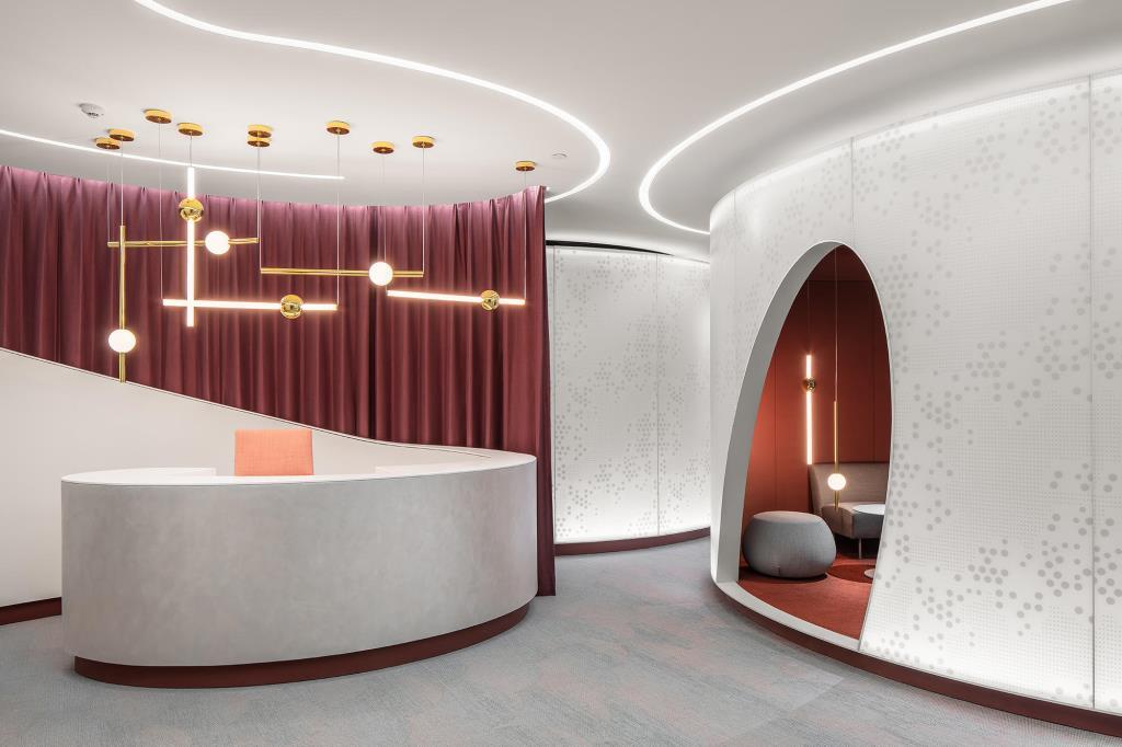 Al bianco, che domina e sottolinea i volumi architettonici, si affianca il rosso, simbolo di energia e dinamismo e artefice di suggestivi effetti visivi, mentre il rosa è utilizzato come elemento di raccordo fra gli ambienti. La reception ospita due originali strutture cilindriche, che fungono rispettivamente da area di attesa e di lettura e si connotano per un’impronta futuristica e al tempo stesso elegante sottolineata dai tagli obliqui delle aperture di accesso.